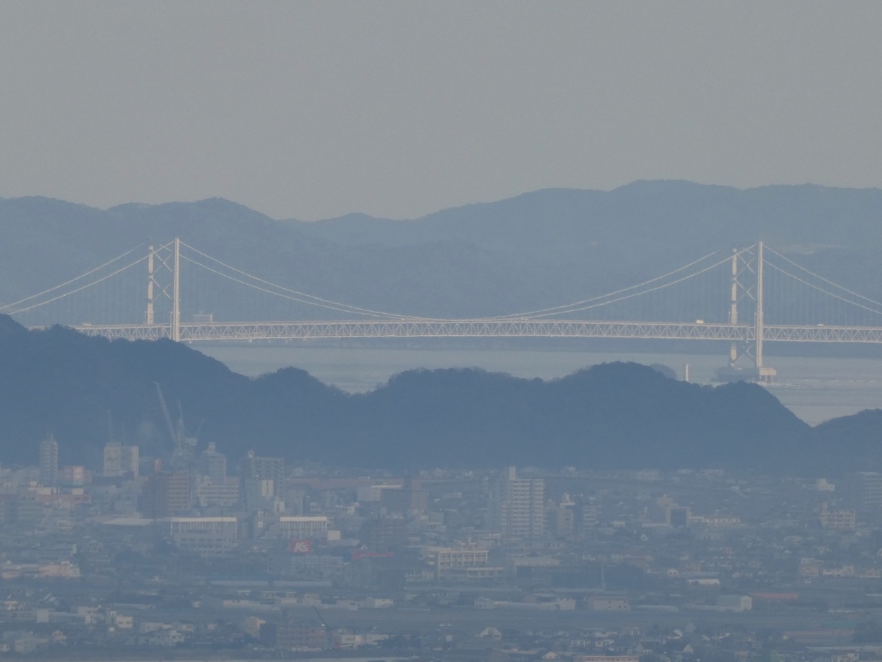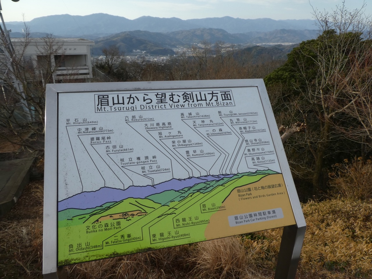 眉山は徳島の市街の背後にそびえる290mの小山。ふもとの天神社から20~30分で登頂できます。ロープウェイもありますが、お手軽な登山がおすすめです。実際、地元の方の散歩が多いです。最初は階段ばかり。だんだん山っぽくなります。滑りそうな道なので雨のあとは注意です。100mごとに標柱があり、目安になります。標高ではなく距離標です。山頂からは大鳴門橋から和歌山や淡路島までよく見えます。三角州に発展した徳島市街の様子もよくわかります。山頂には神社とパゴダと公園がありますが見晴らしが一番です。