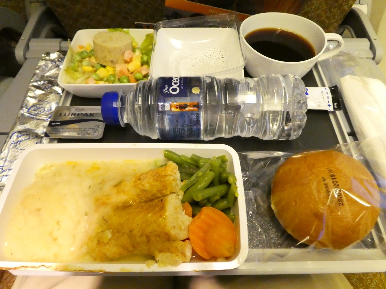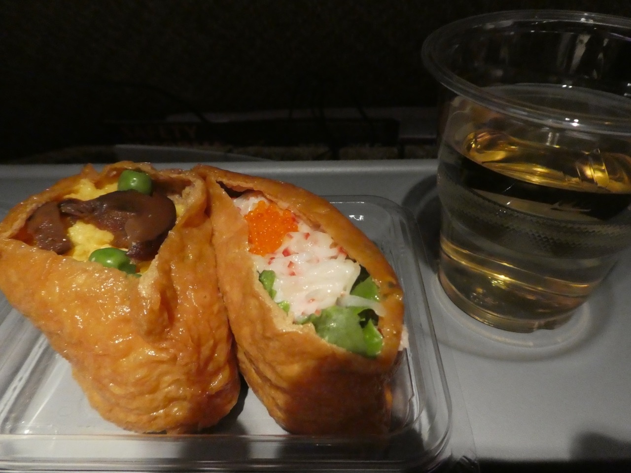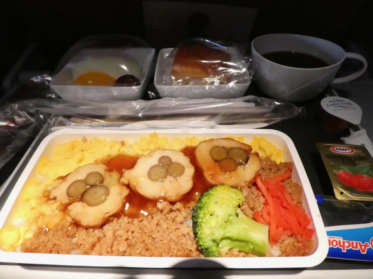 機内食は、今までの0時ころの便と同じく、飛び上がってすぐに夜食、到着前に朝食がでます。