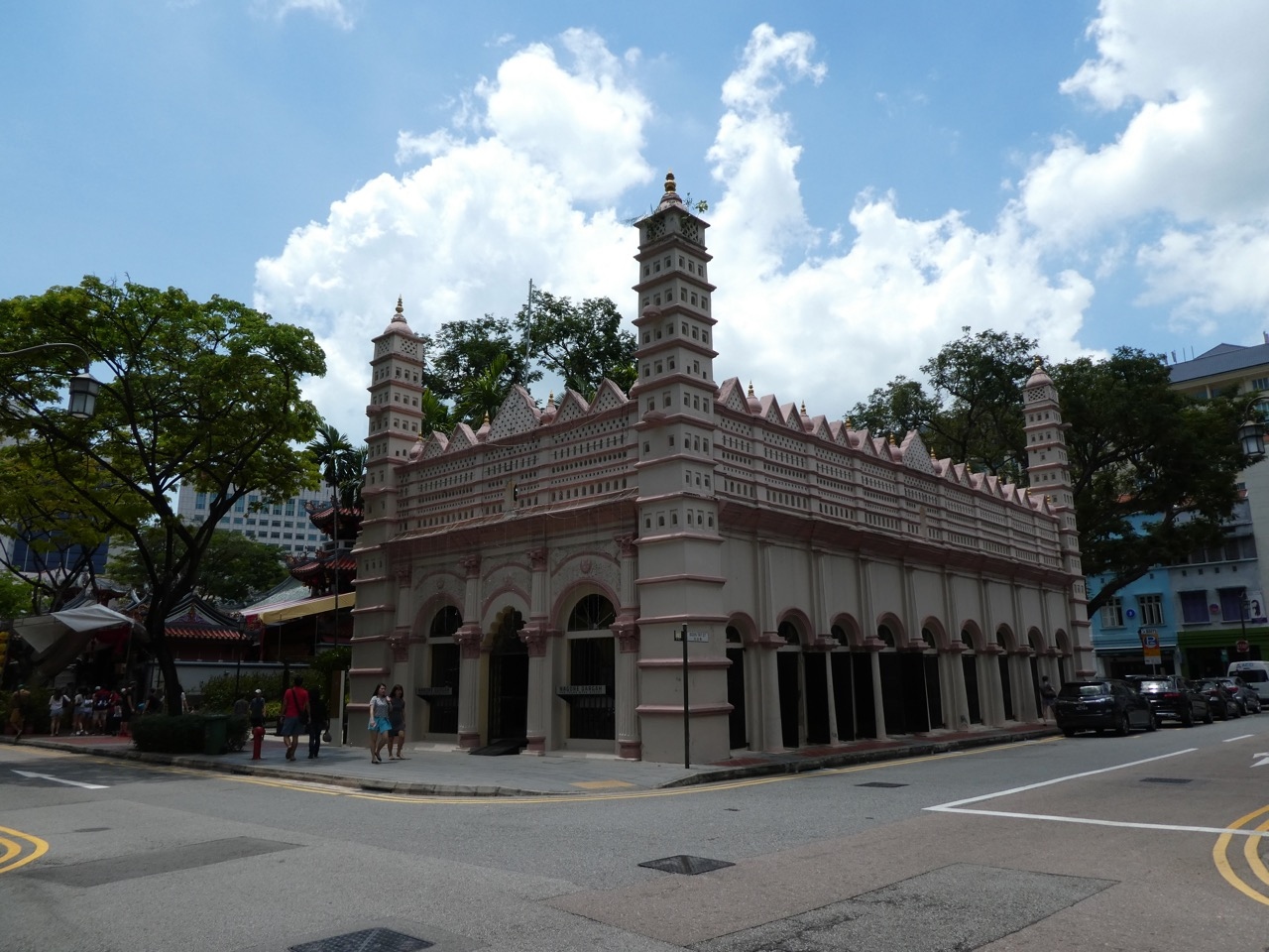 天福宮に行く手前にある四角いピンクのイスラム寺院。外観がアーチの連続の上に縮めてつくった街を載っけたような面白い外観です。強いて言うなら窓いっぱいのように見せた東京都庁のような擬似多層建て。
