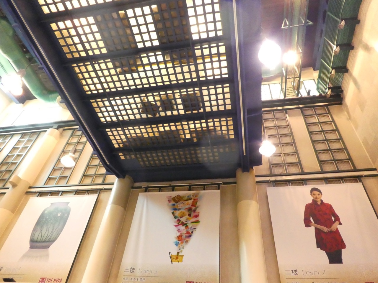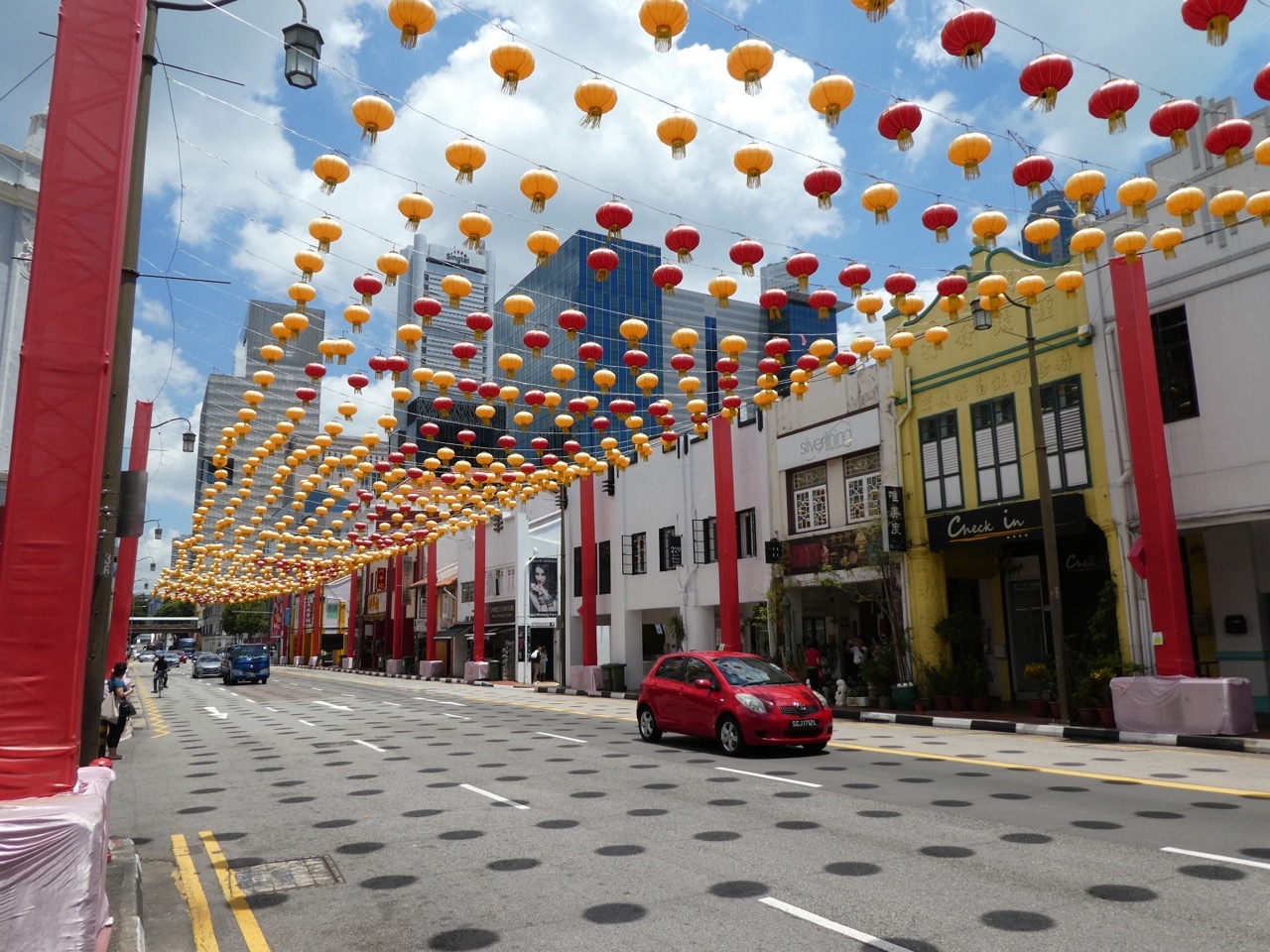 それより道路の装飾がきれい。道の上に提灯がずらりと吊るされます。昼間だったので、太陽の影が路上にドット模様。なかなか見事です。- 旅行時期