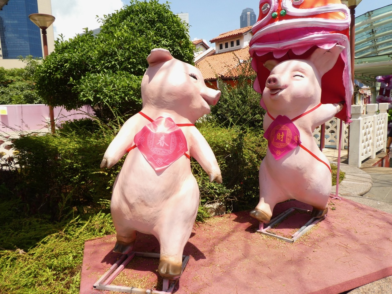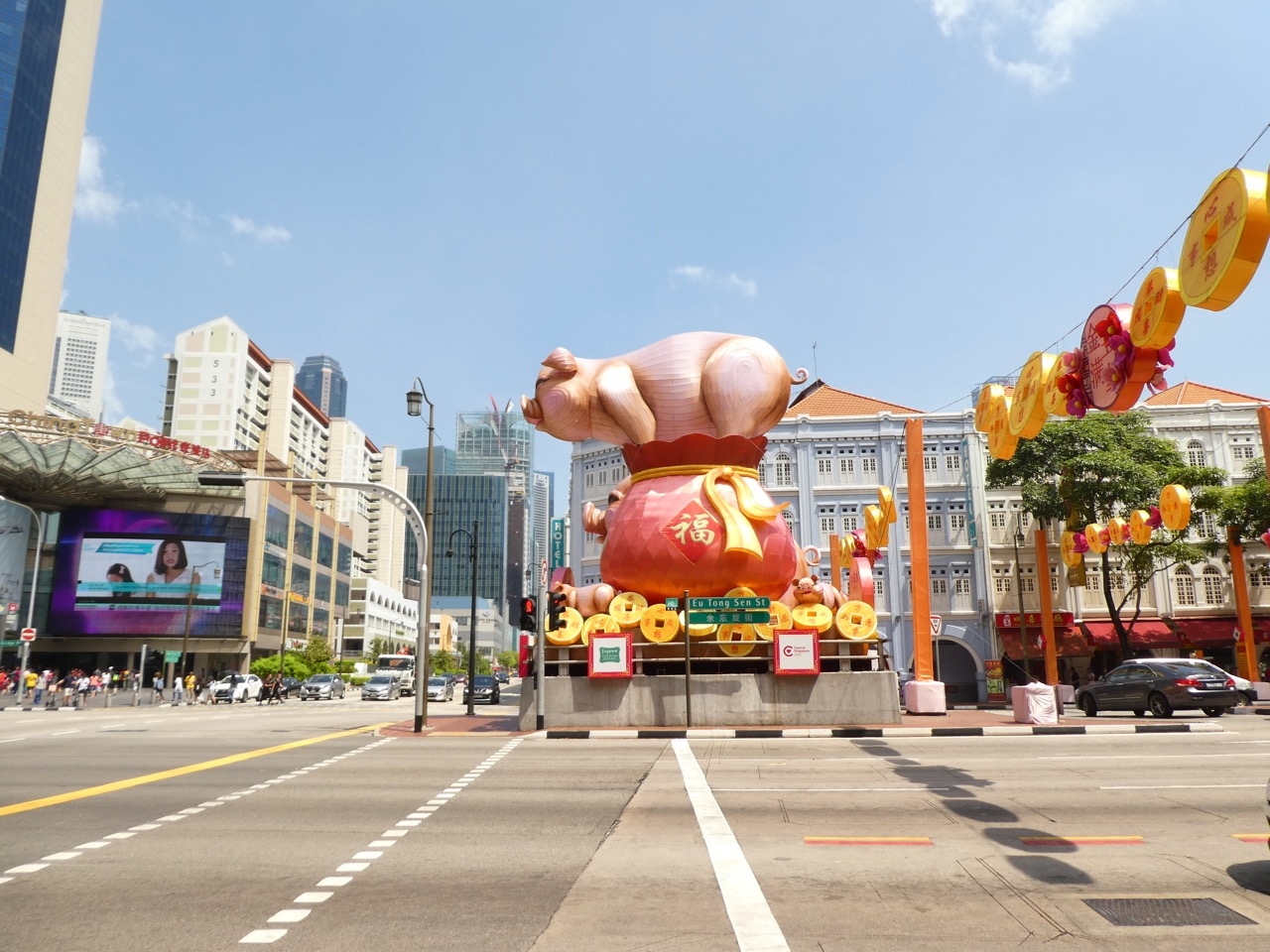 チャイナタウンで春節の飾りをいっぱい見ました。干支はイノシシの年ですが、どう見ても豚です。中国ではほぼ同義のようです。それにしてもあまりに大きな像に圧倒されます。もうちょっと可愛い干支の年に見たかったかも。