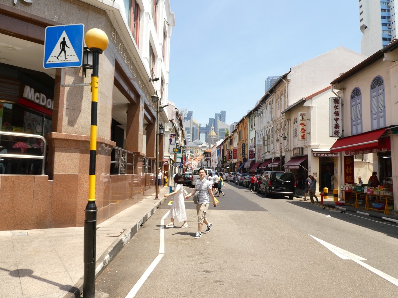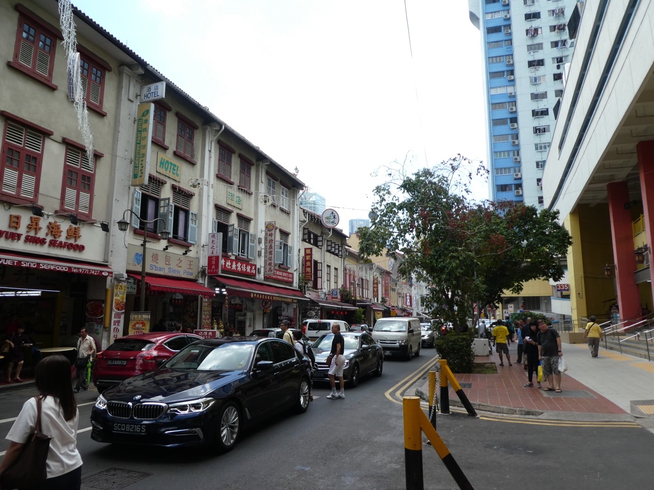 チャイナタウンでもにぎやかなあたり。チャイナタウンコンプレックスにも面しているので人通りも多いです。ところが車の通行も多いのです。並行するテンプル・ストリートが東行き一方通行なのにこちらは駐車場がある関係で両方向。なので、西行きの車も多く、狭い通りなのに横断するのが難しかったです。南側の歩道が広いのでこちらを歩くのがいいでしょう。東の方はチャイナタウン・フード・ストリート。観光的なホーカーです。ツアーでの食事に使われることもあり、手軽に食べるにはいいでしょう。