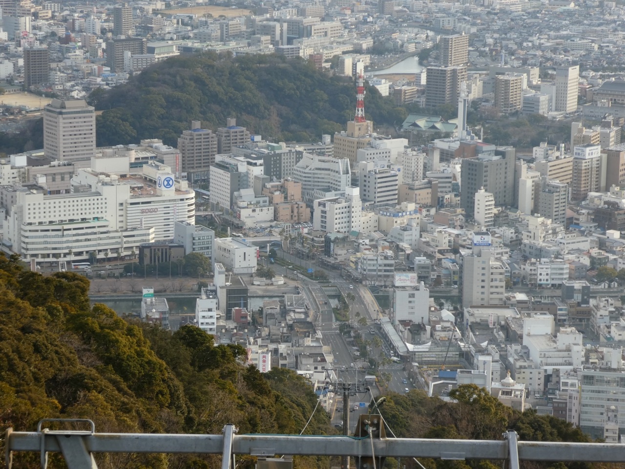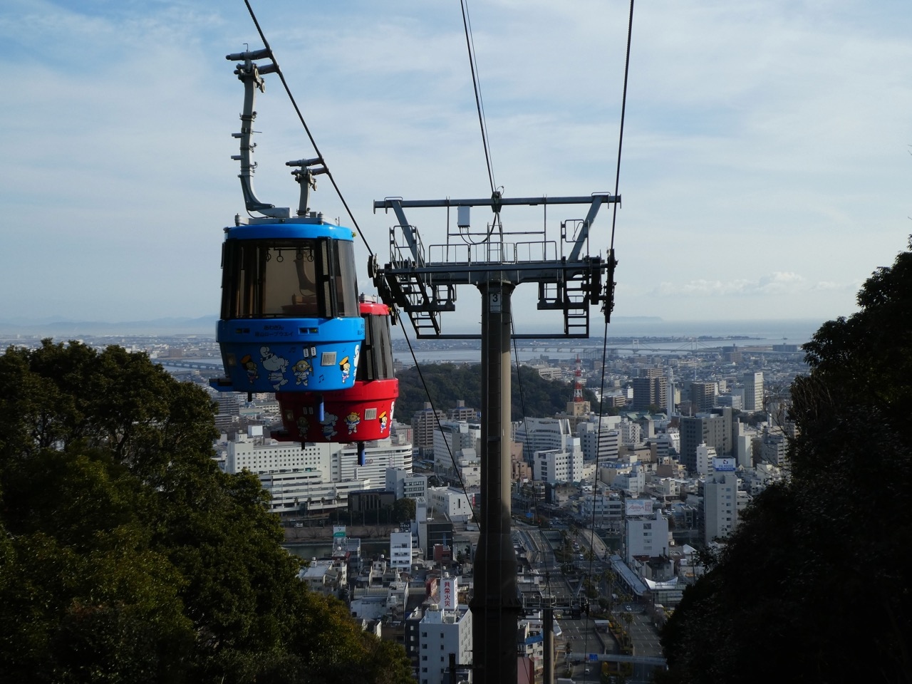標高290mの眉山への一番楽なメインの登山手段。昔は小さなゴンドラだったように思いますが、久しぶりに訪問すると、2連の丸っこい可愛らしいゴンドラになっていました。ロープウェイで連結しているのははじめて見ました。展望席がいっぱいとれるので眺めの点ではいいですね。まあ、連結といっても本当につながっているのではなく電車的にいえば続行運転のような感じです。どうなっているのかまじまじと観察してしまいました。