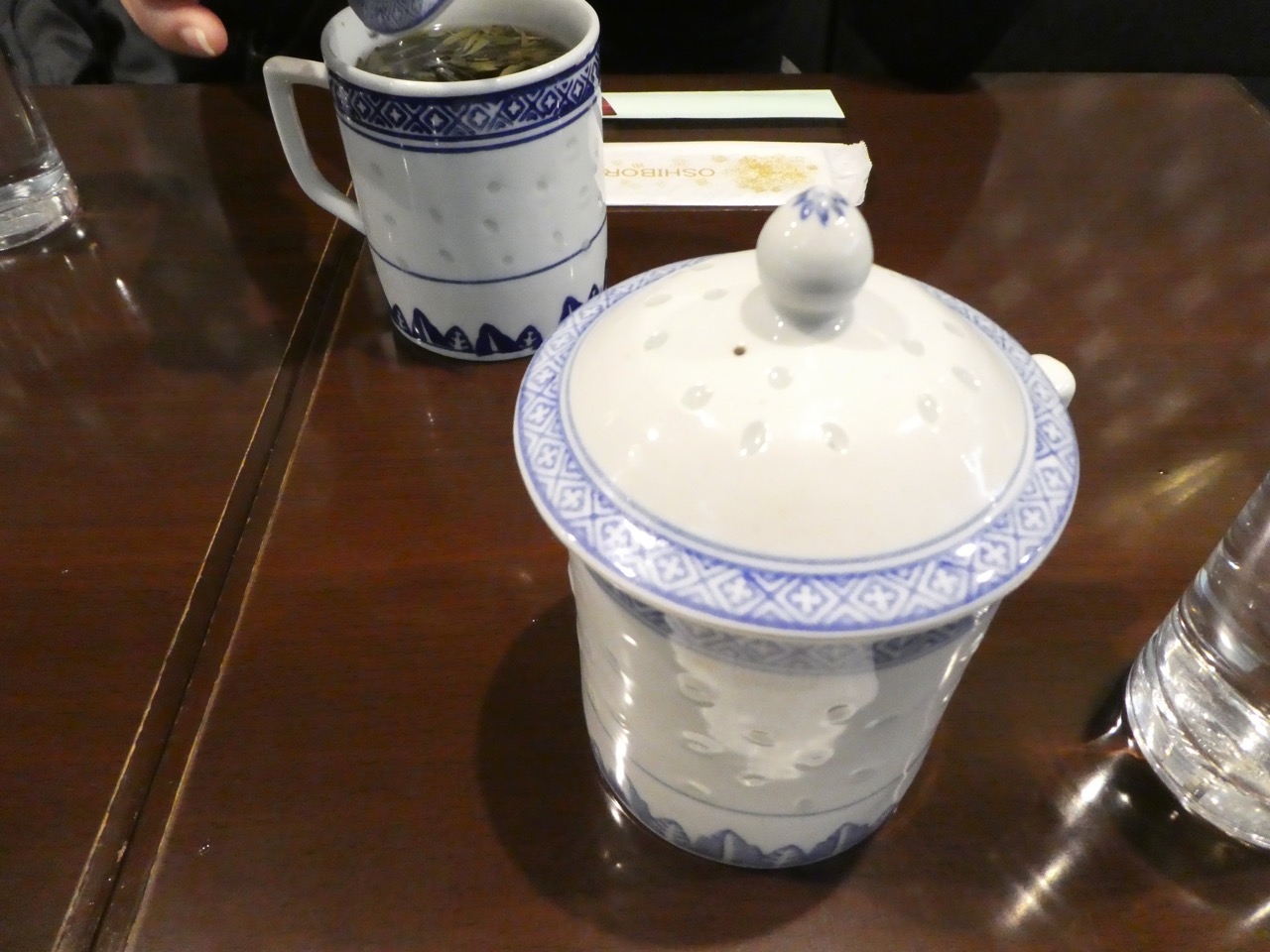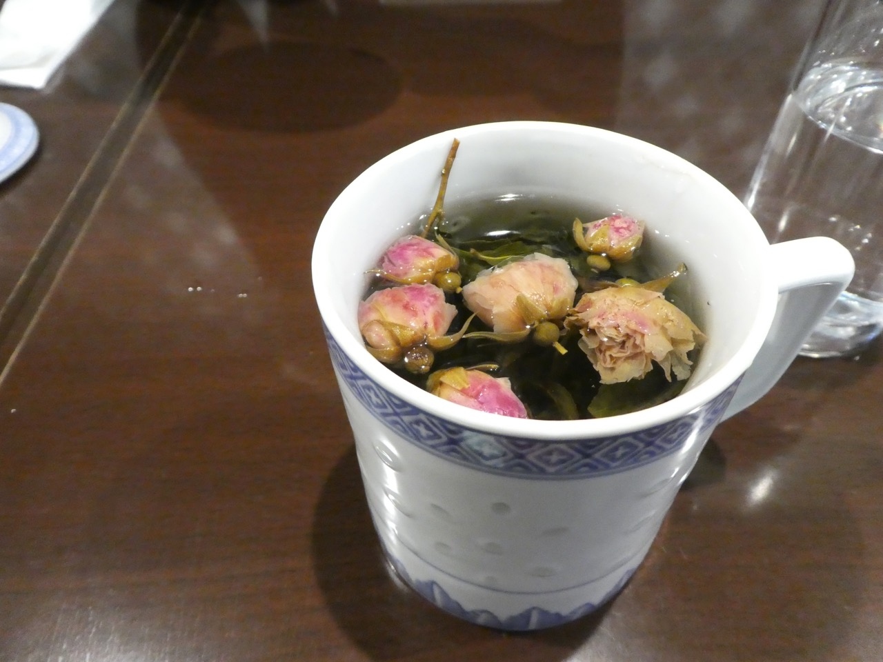 さて、メニューにお茶がいっぱい。白ボタンとか黒バラとか。それに工芸茶もあってこれらはお湯は3回くらい継ぎ足しても味が出るとのことでそのようにしました。お得です。