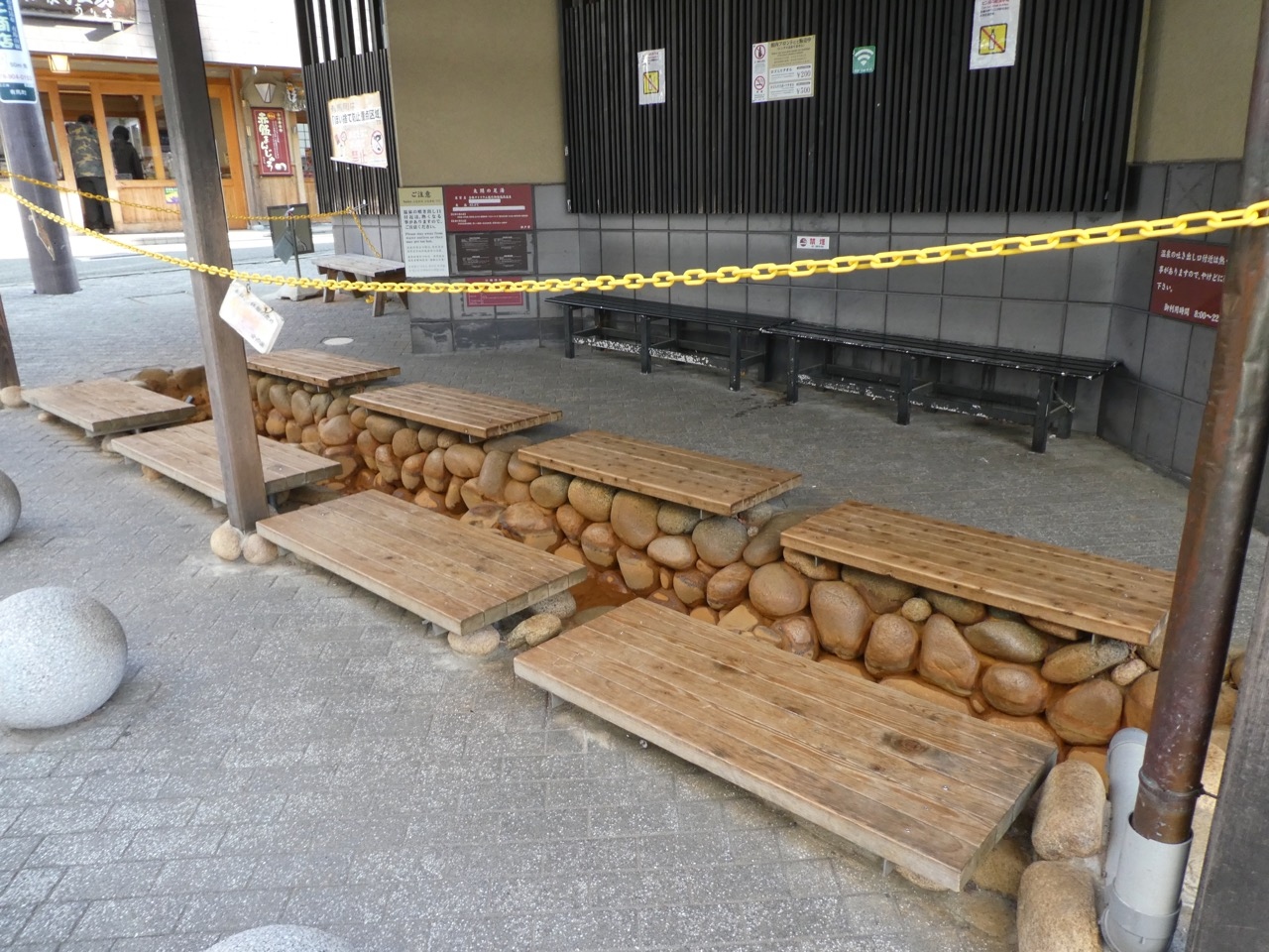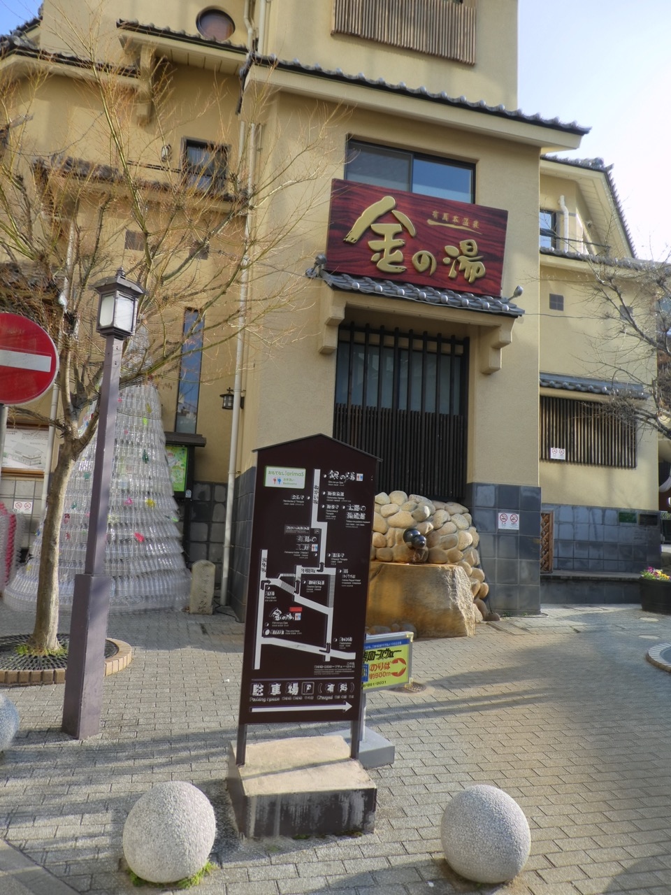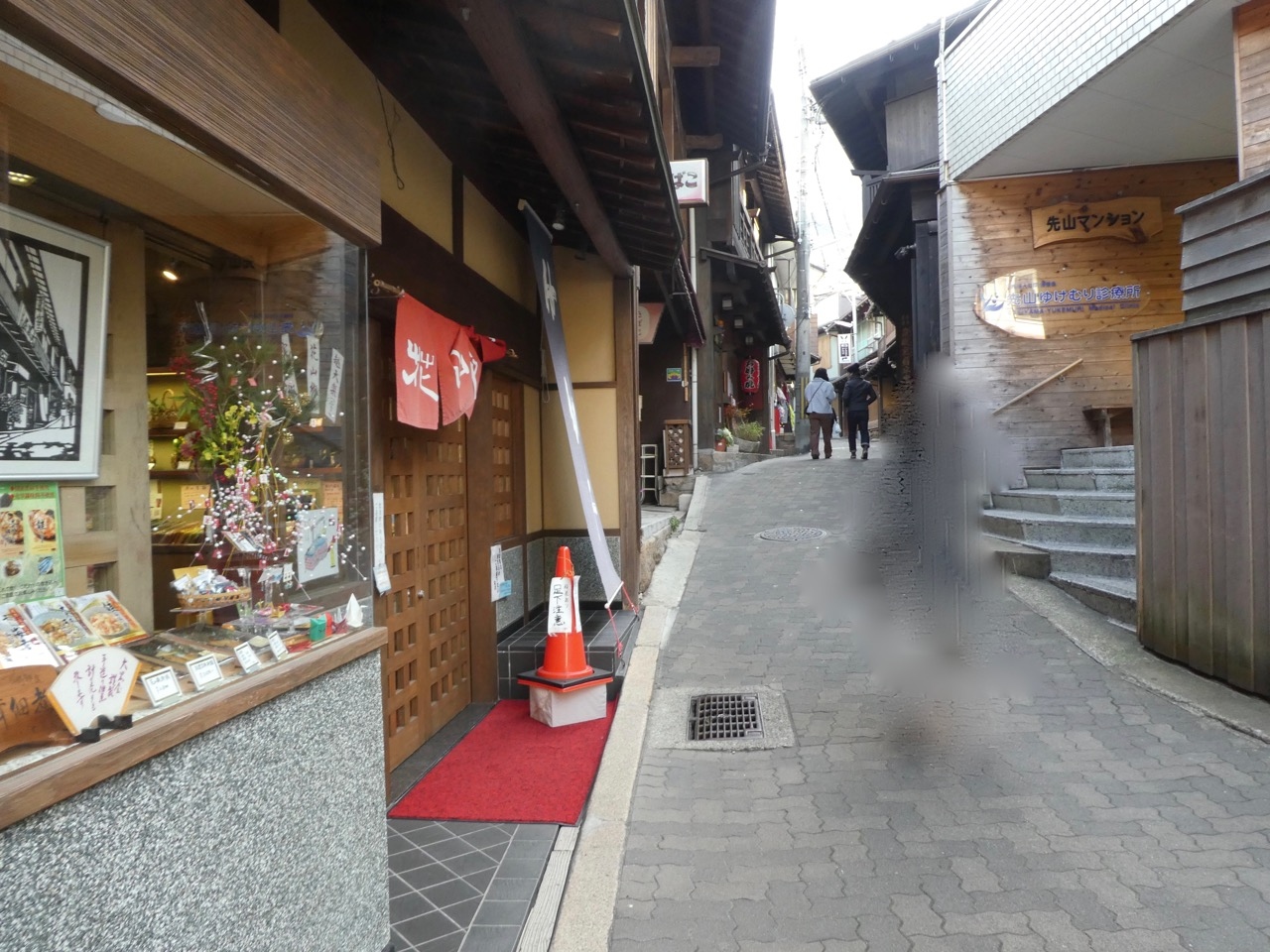 温泉街らしいゆるやかな石畳(いえ、インターロッキング=コンクリートブロックですが)の坂道の商店街です。金の湯のあたりでは魅力的な階段の横道もあったりして温泉街の情緒を感じます。