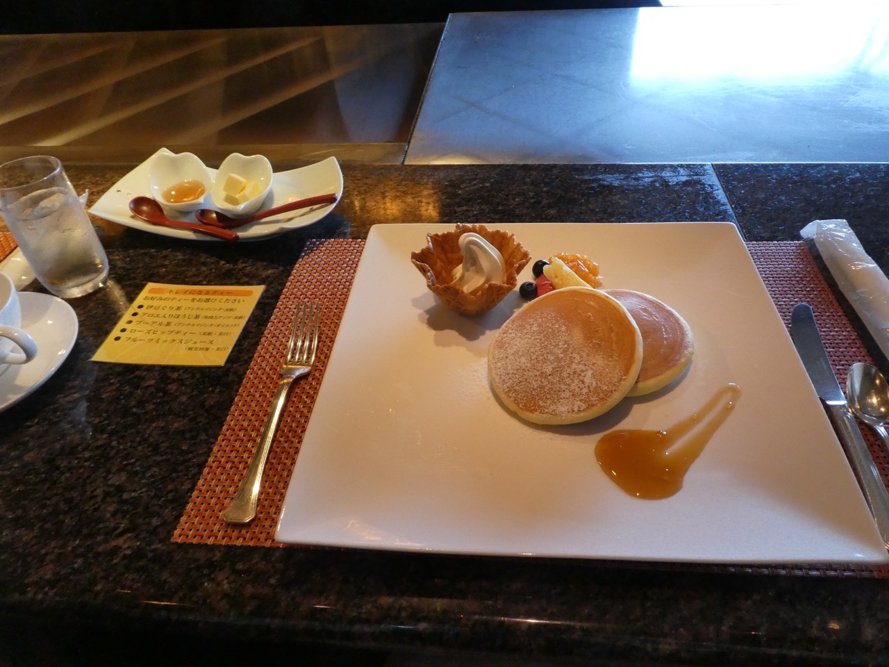 まずホットケーキのアフタヌーンティー14:00~15:00。露天風呂。休憩コーナーでジュース。姉妹ホテルのつるや吉祥亭の温泉満喫+貸切露天風呂1回無料。宿泊者限定海岸の黒根岩風呂無料。ホテルに戻って湯上りのジュースとトコロテンとカワハギ干物。ディナーは趣向をこらしたフルコース。お祝いのくす玉。ムーンロード見ながら露天風呂。ラウンジでコーヒーとお菓子。お部屋の展望風呂。朝日の露天風呂。朝食は目の前で焼く卵焼きとフレンチトースト。部屋でのんびりしてから、ラウンジでコーヒー。