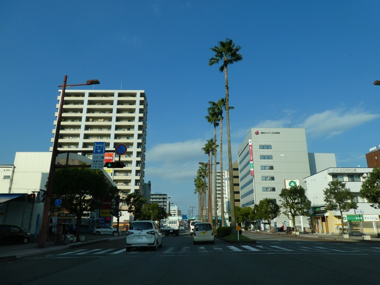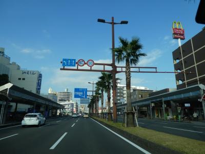 南国というか、日本で南の方の都市で目立つワシントニアパームの並木道。宮崎はいたるところにあり、中でも繁華街にこれほどの規模と長さで街路樹になっている街は宮崎くらいでしょう。橘通りの並木道です。
