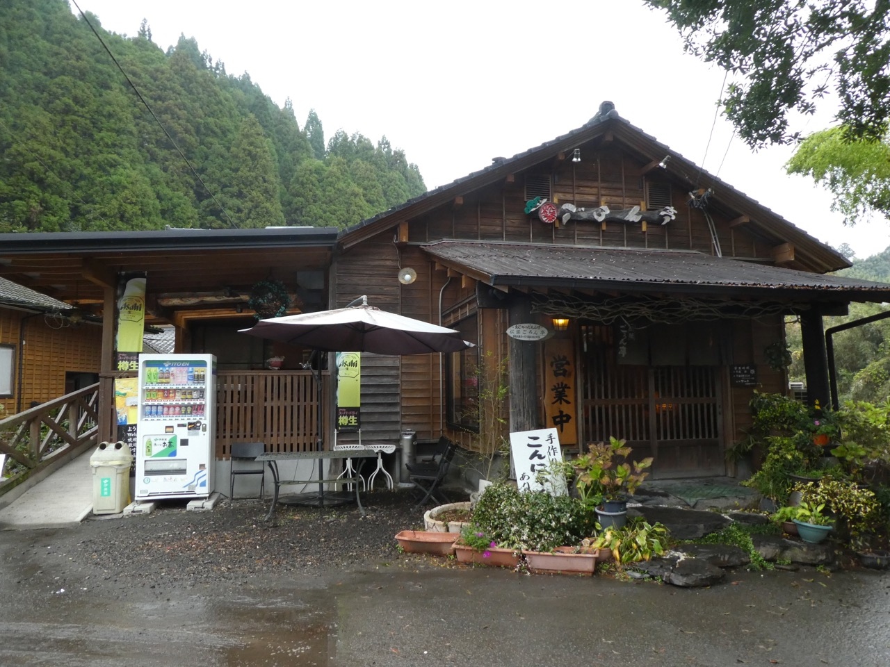 メニューにイノシシ肉が目立っていたのでうどんと焼肉をそれぞれ注文。ちょっと野性味があるかなというやや硬い豚肉といった感じでした。焼肉の方は炭の入った火鉢が持ってもられて自分で焼くタイプ。懐かしいです。なので時間がかかります。ちょっと燻され感はありますが天井が高いのでさほどでもなかったです。訪問時はコーヒーやお茶がセルフでした。お茶は前回の夜もそうだったのですが、コーヒーは案内がなかったのですがランチのときだけかも。滝が見える窓辺での野生の味