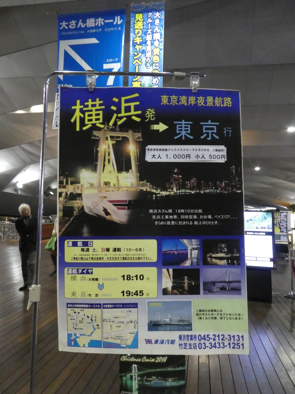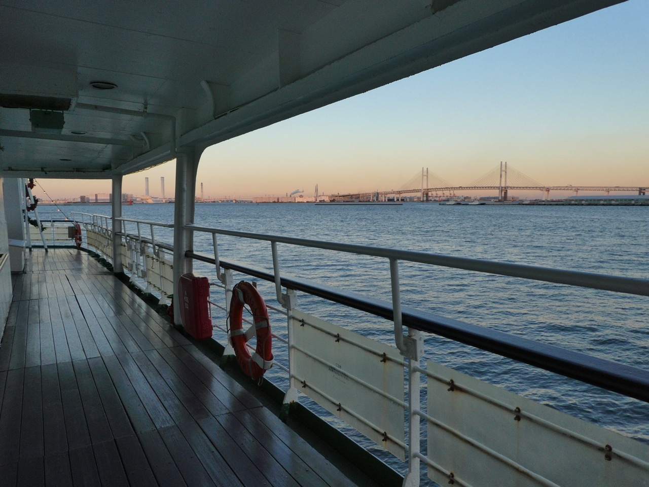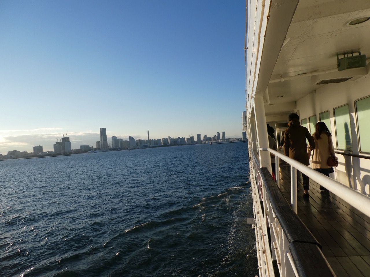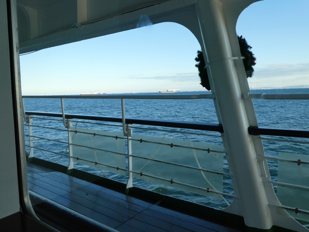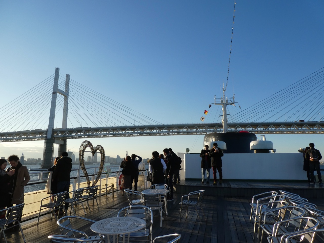 甲板散歩は気持ちいいです。ちょっとだけ外海航海気分。房総の山々が見えます。東京湾を行く船がいっぱい見れます。とくにベイブリッジ潜りがハイライト。船の方に記念撮影をお願いすると撮ってもらえます。