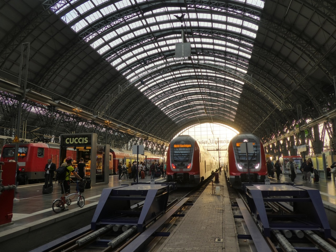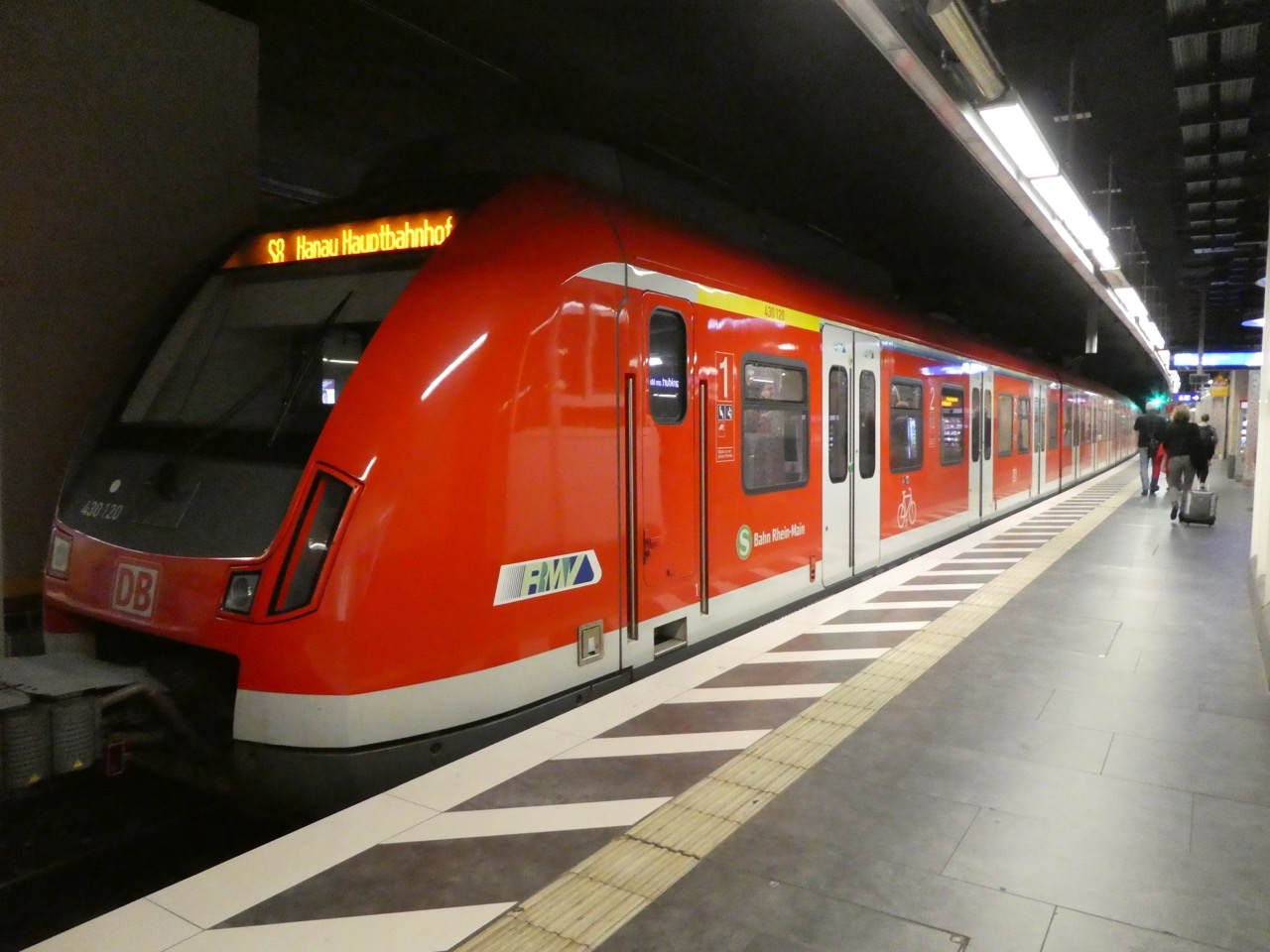 フランクフルト中央駅では長距離列車は地表ホーム、Sバーンは地下ホームです。地下ホームはいろんな系統の列車が束になってくるので頻発。なので乗る行き先の列車をきちんと確認して乗らないととんでもないところに連れていかれてしまいます。基本3ドアの通勤型で、ボックスシートです。まあまあ旅情は楽しめると思います。