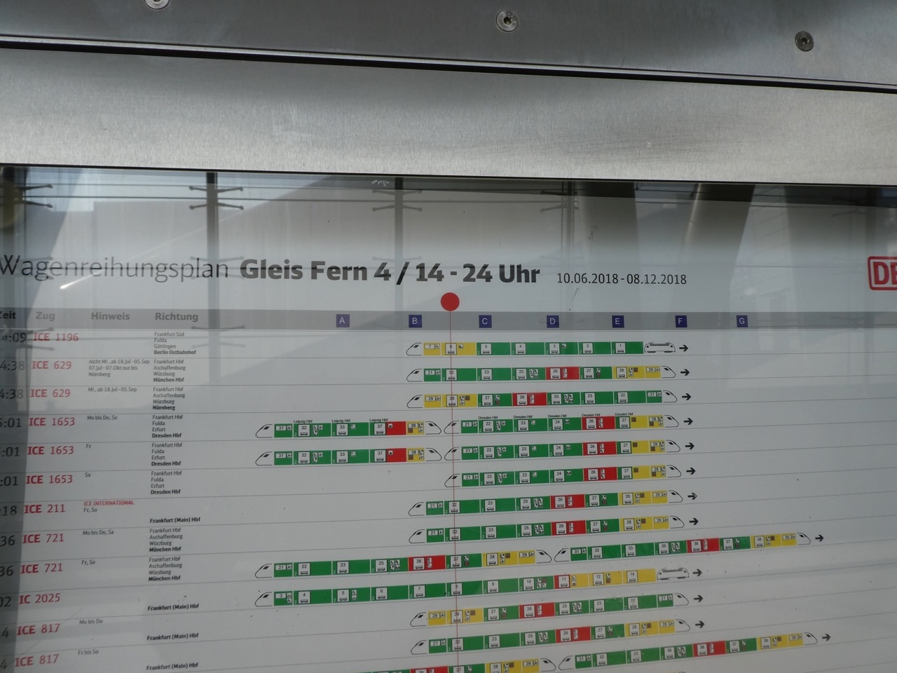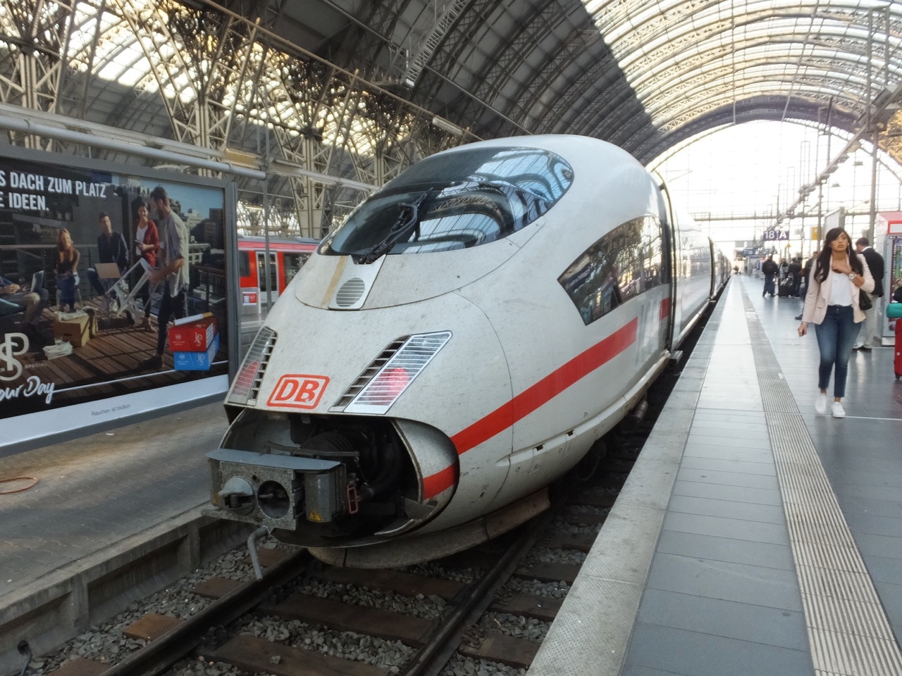 よく遅れます。運休や番線変更も多々。乗るまで(乗ってからも)気が抜けません。ホームの表示と人の動きに注意しましょう。基本、フランクフルト駅発着でライン川畔を走るICEはごくわずか夕方に。空港駅やマインツからはICと併せて1時間ごとにありますので、景色を楽しみたい方は乗り換えの一手間かける必要があります。- 旅行時期
