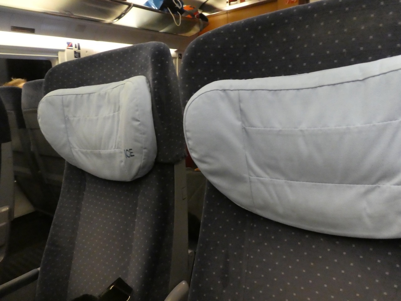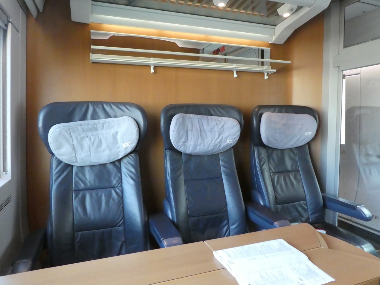 ドイツ国内を網羅する高速列車ICE。行き先によってだいたい形式が決まっていて、ケルン方面の列車は勾配のきつい高速新線を通る関係でICE-3という高速タイプ。330km/h出るそうですが、普通は300km/h。疾走感はすばらしいです。ベルリン行きはICE-Tという準高速タイプで、たまに食堂車のない列車があるので注意。1日1往復だけ機関車牽引のICEーMETというタイプがあり、これは2等車でも3列シートなので乗り得です。訪問時はフランクフルト空港14:09のベルリン行きに使用されていました。ウィーン行きもICE-Tでした。バーゼル行きはICE-1でした。