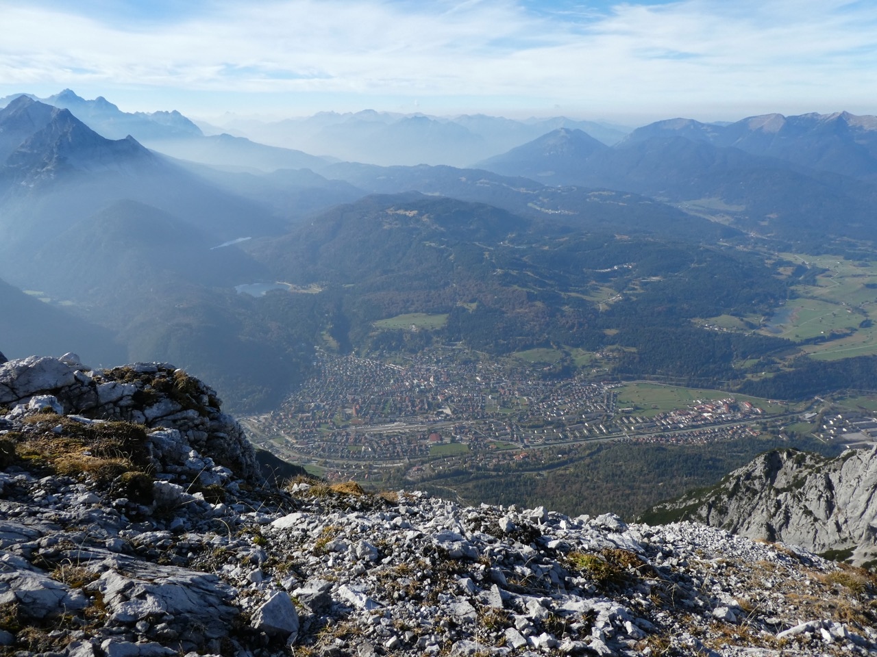 頂上から見下ろすミッテッバルトの街。はるかに連なるドイツアルプス。見事です。