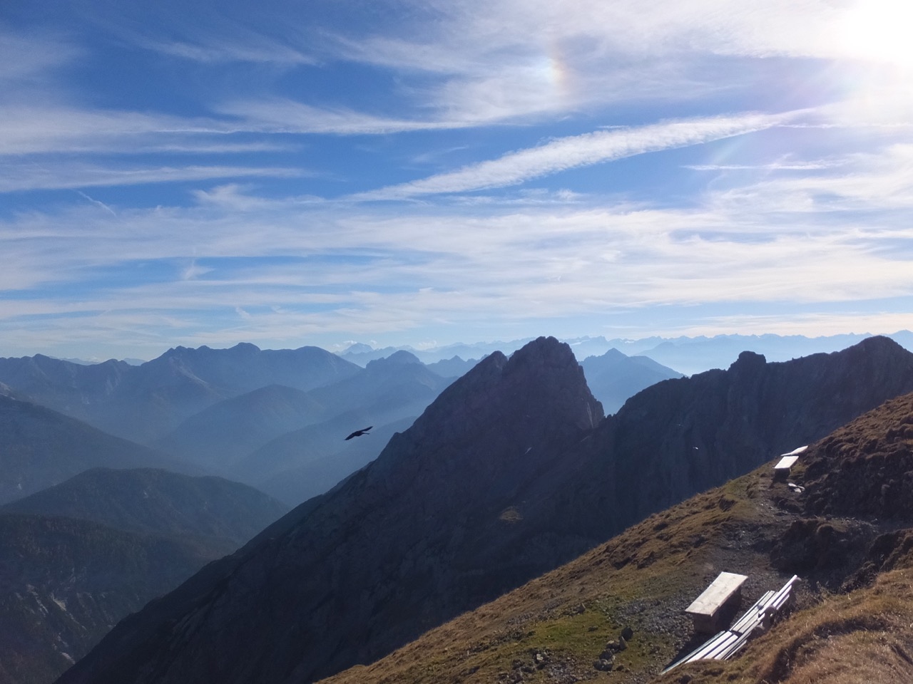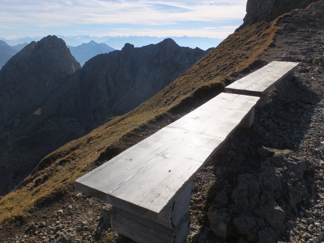 そして1周約1時間の山頂遊歩道を歩きましょう。尾根に出るとはるかスイスアルプスが地平線を埋め尽くしています。そして急勾配の下は山奥の小さな村と草原。あまりの絶景にめまいがしそう。そしてここがオーストリアとの国境。