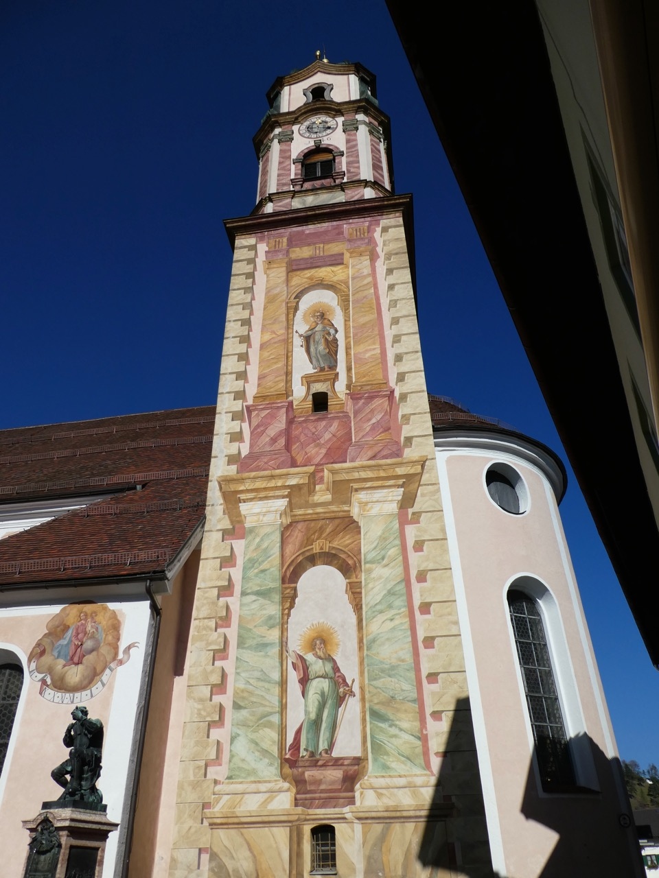 ミッテンバルトはフレスコ画で有名。家々の壁にさまざまな物語の絵が描かれています。それは街の中心の教会も例外ではありませんでした。彫刻か、とおもったら全部絵なんです。これが普通だったら「だまし絵」と言われるのでしょうが、この街ではきれいに調和しています。見事な外観の教会でした。