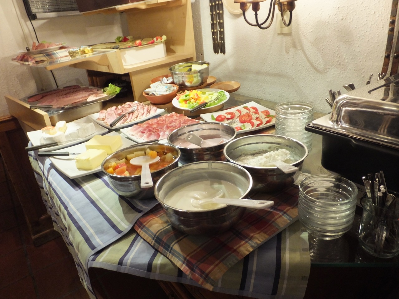 朝食は素晴らしいです。パンはいろんな種類が山盛り。チーズやハムも種類多すぎ。パンにつけるジャムや蜂蜜もいっぱい。