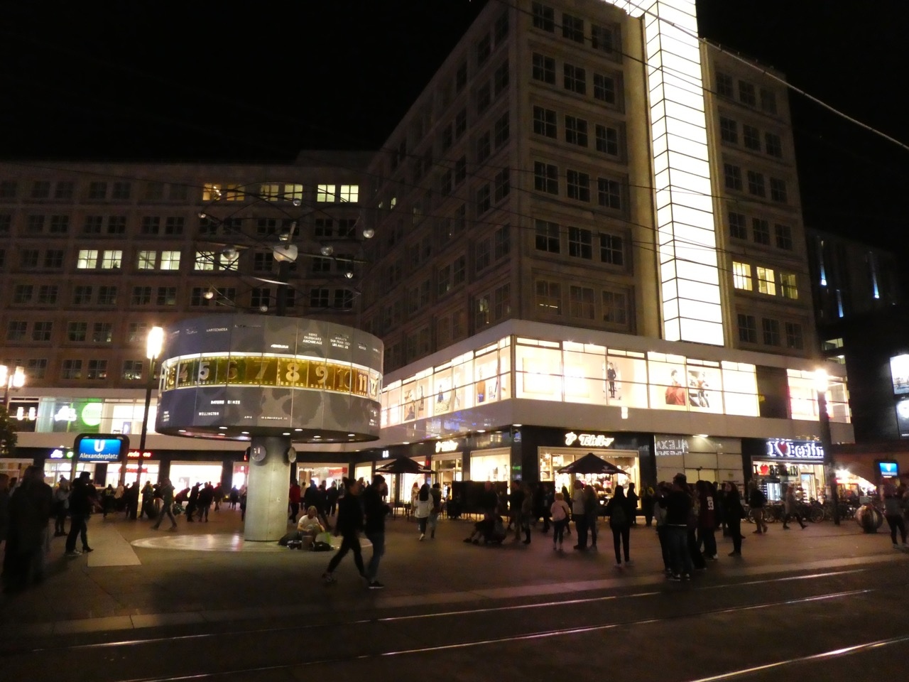 アレクサンダー広場駅前、北側広場の東側。トラムの線路よりも東側にひっそりと建つ円盤の上に何か針金細工が乗ったようなモニュメント。世界時計というのですが24時間の表示があるだけでどの部分が時計なのか一瞬わかりませんでした。各国の都市の名が記されているので、ああ、文字盤が回転してるのか、とやっとわかりました。便利といえば便利なアナログな時計です。