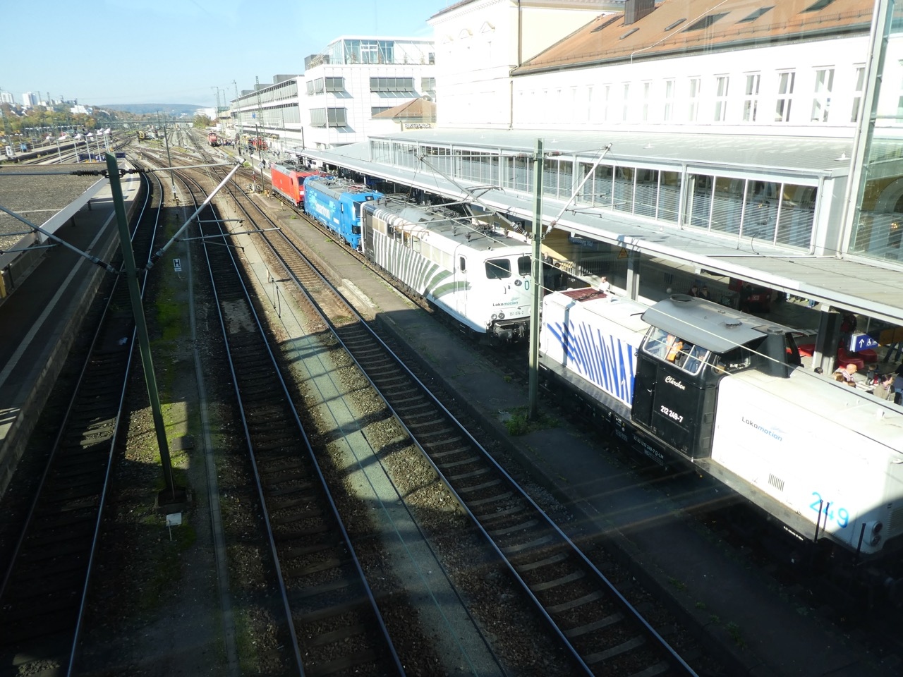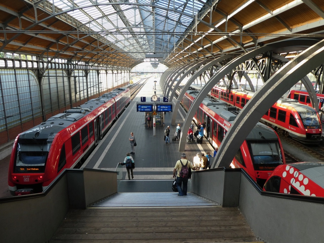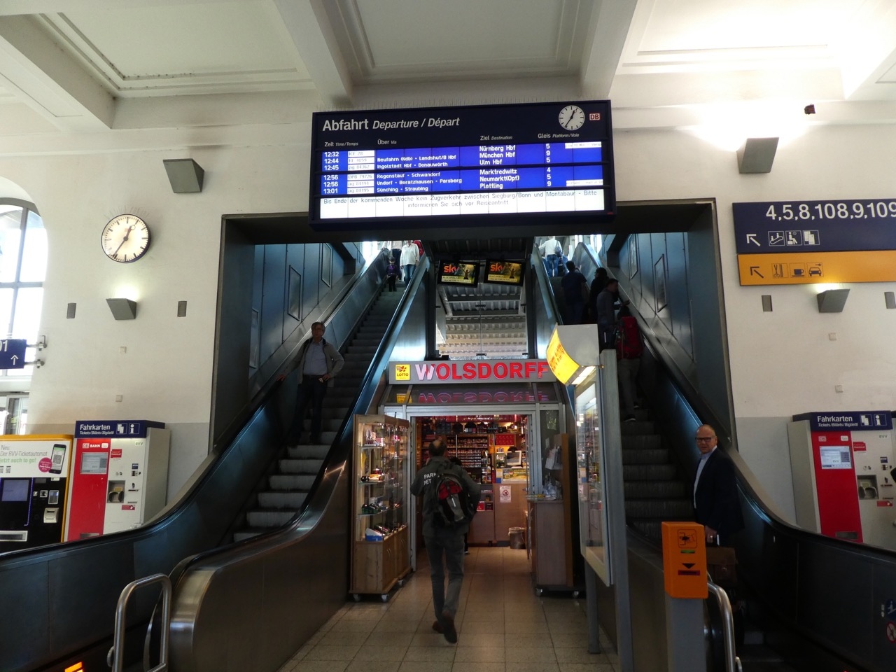 ドイツの駅はホームにわたるのは地下道が普通なのですが、ここの駅は真新しいガラス張りの跨線橋がありました。駅舎はそう古くはなさそうですがリニューアルされています。駅舎から直接エスカレータでガラスの跨線橋におどり出る構造は見事です。