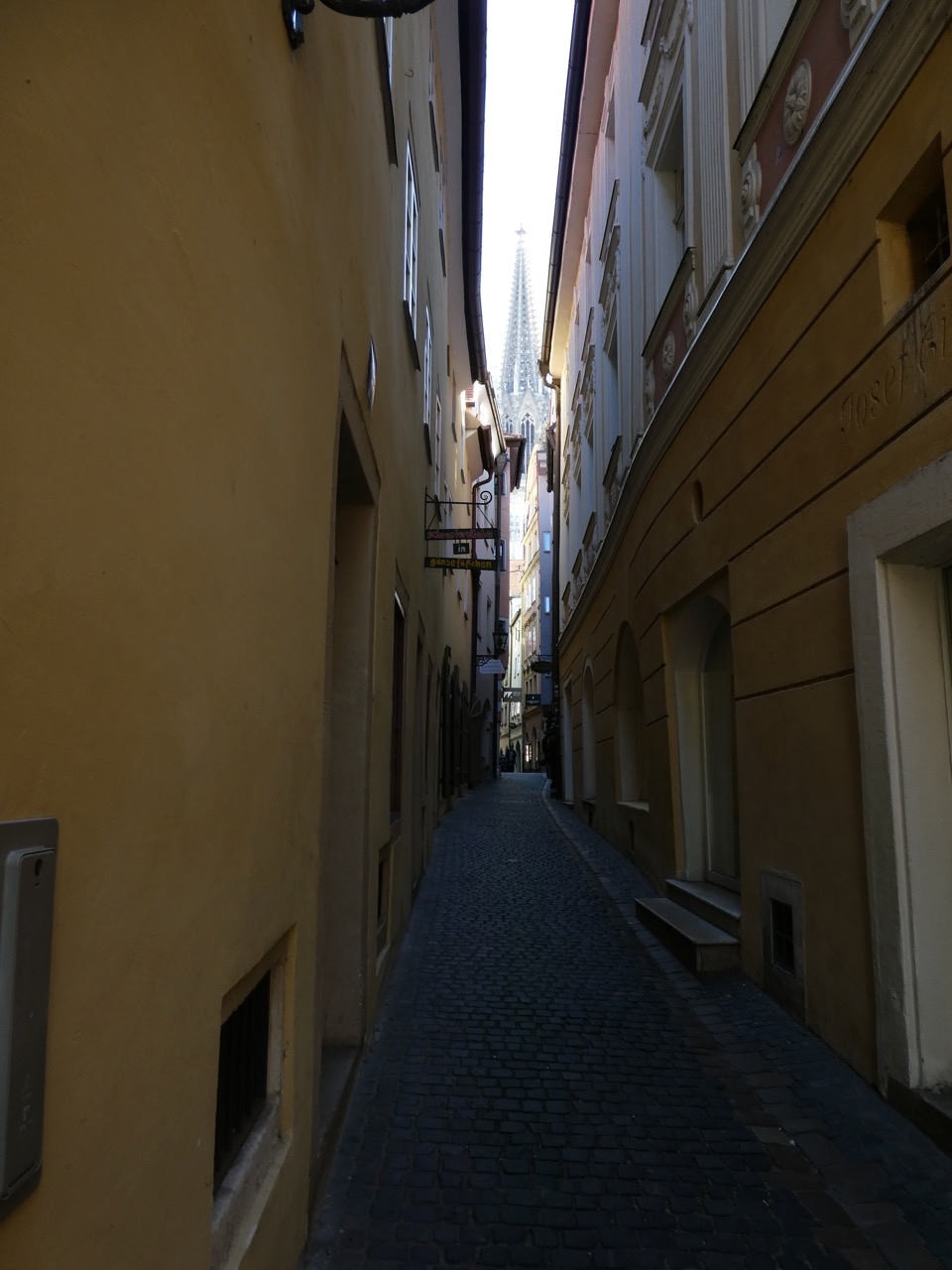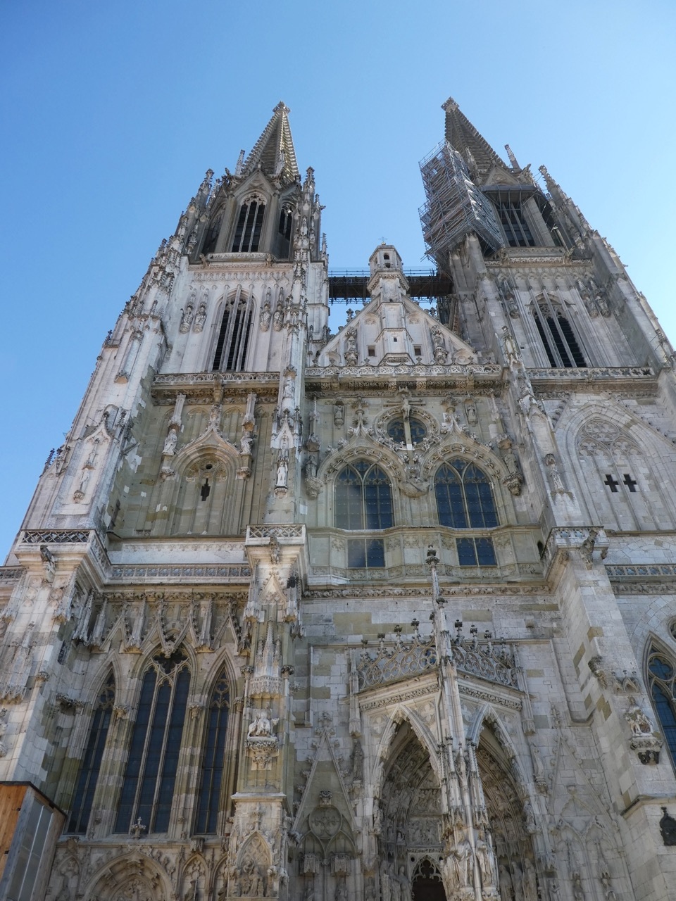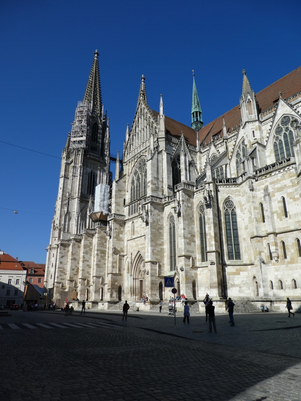 レーゲンスブルグ中央駅から徒歩で10分ほど。旧市街の真ん中。正面の広場が狭く、正面からの写真は見上げる形しかできません。正面向かって右側はやや広く、側面からの全景は撮りやすいです。豪華なのは正面ですが側面もなかなかのもの。建物の屋根自体が十字架っぽい形になっていることもわかります。