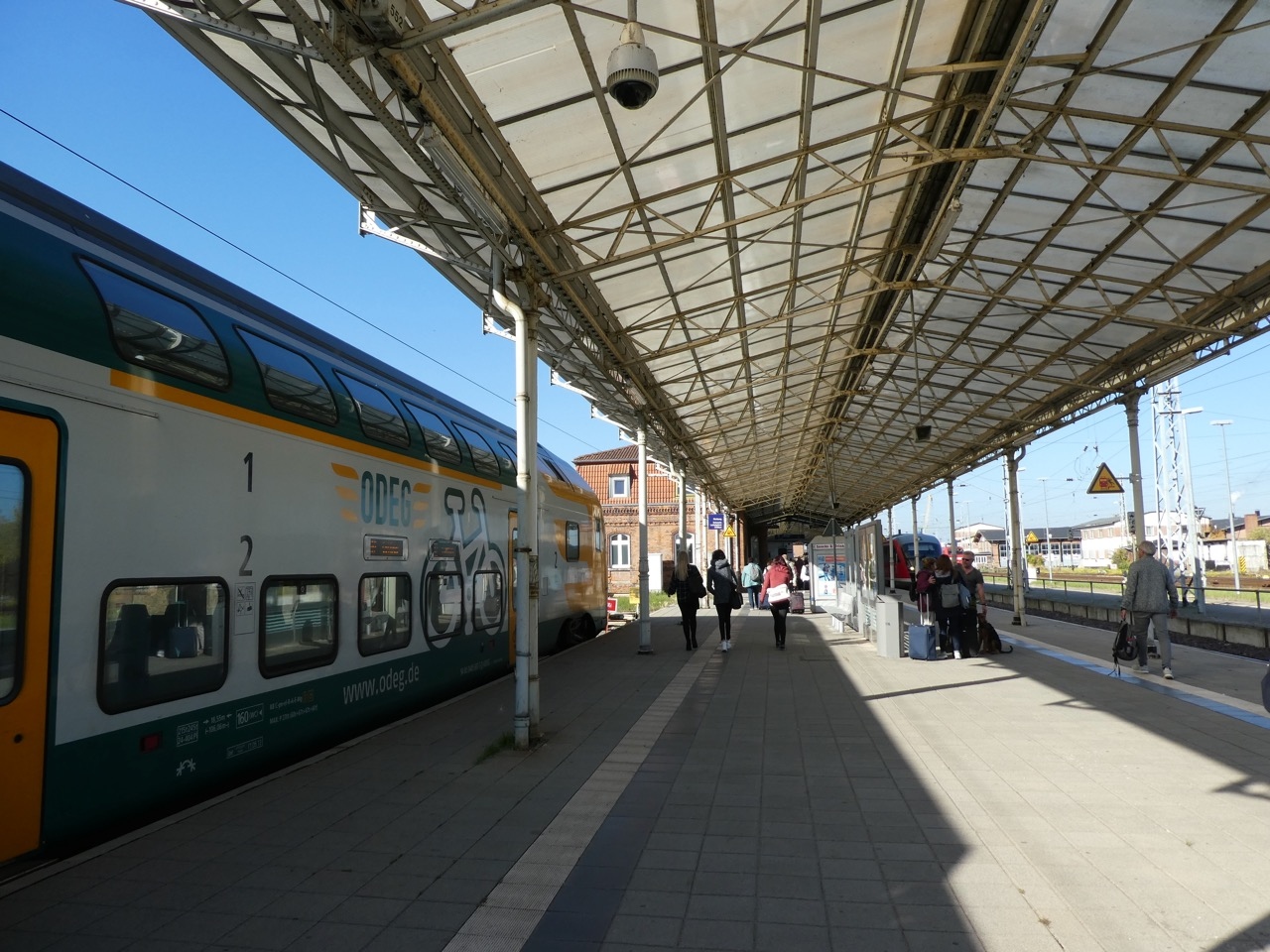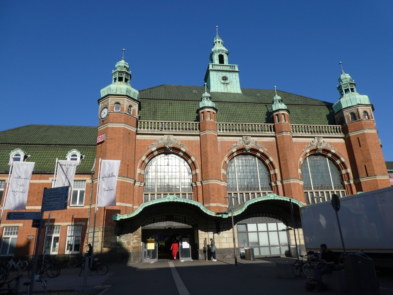 駅前からほんの3分くらいで湖です。右折して5分くらいで市街地、その通り抜けた先にシュベリーン城があります。そのへんだとこの中央駅より、隣駅の「シュヴェリーン・ミッテ」駅の方が近いようです。乗車客の多かったです。- 旅行時期