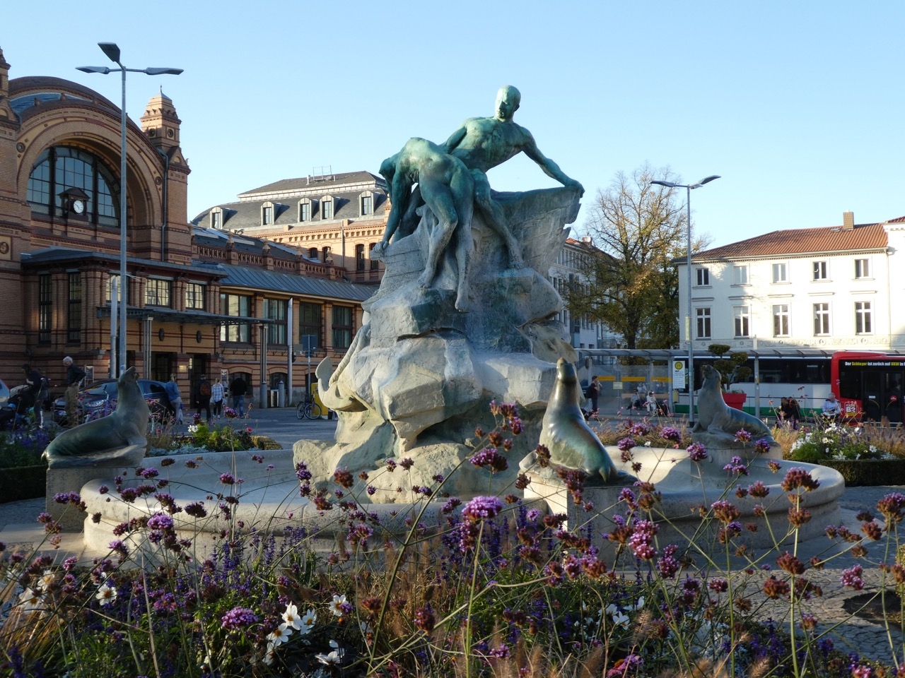 駅前はアシカ(あざらし?)に囲まれたはだかの男女の銅像。何かの神話の場面かなあ?