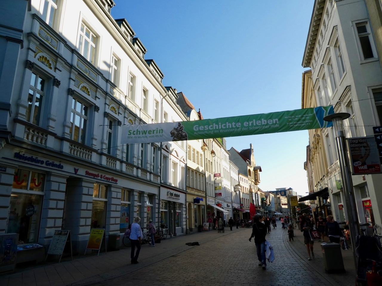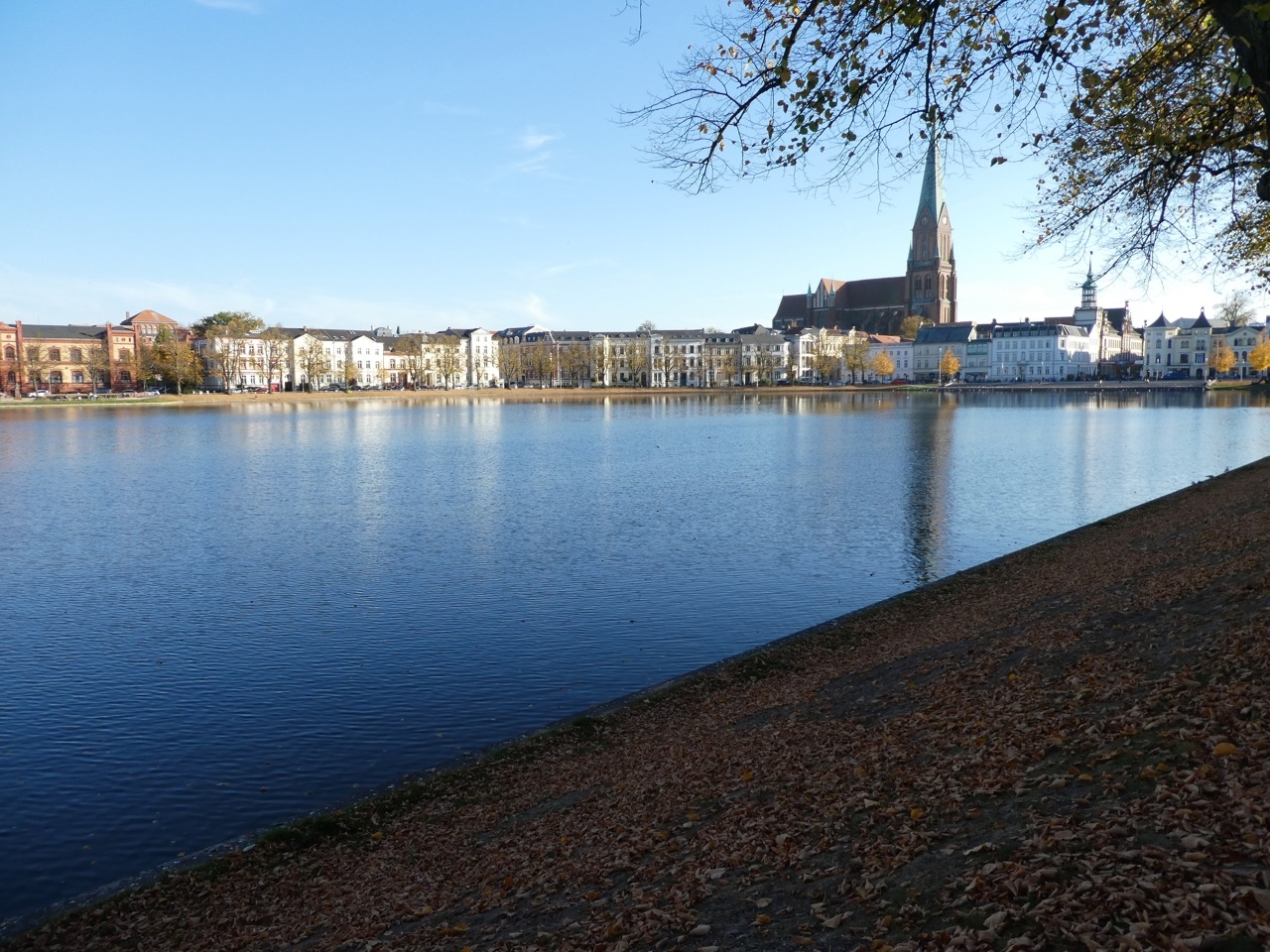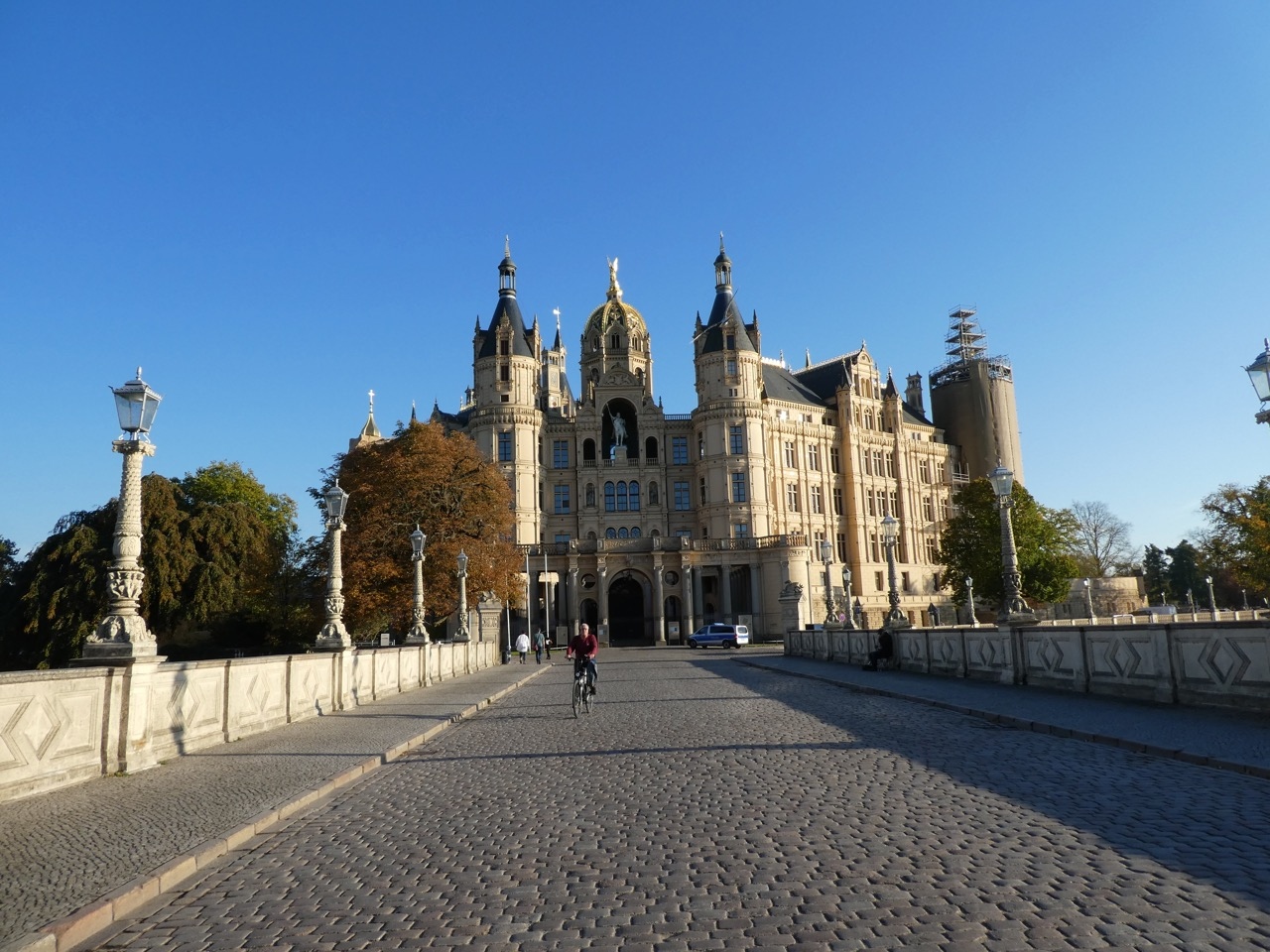 シュベリーン中央駅から徒歩20分くらい。街を通り抜けた先に湖に浮かぶ優美なお城が。ドイツらしくない優美さです。フランスの城を参考にして建てられたそうです。普通に城を目指して訪問すると城をつなぐ橋に出てしまいますので、湖に浮かぶ姿を見るには街のメインストリートのメクレンブルク通りをまっすぐ行ってREWEというスーパーの手前あたりで左に曲がると湖岸に出ますので、そのあたりから眺めるのがきれいです。カップルがいっぱい護岸に腰掛けておしゃべりしてました。陽のあたる夕刻がきれいでした。