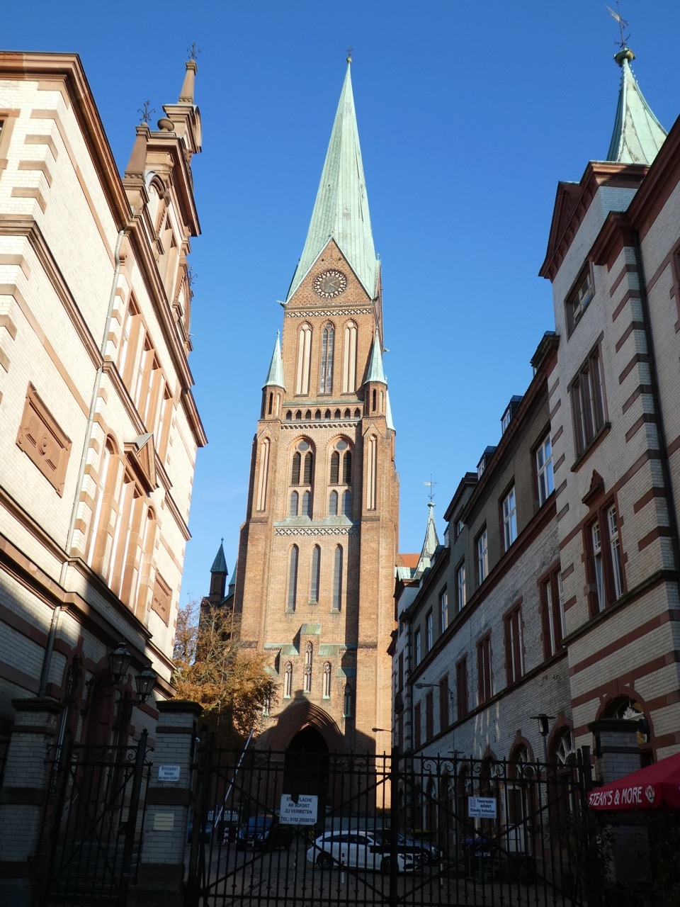 シュベリーンの街は壁の色が黄土色の建物が多いような気がします。その中にあって茶色の高い尖塔をもつこの大聖堂はとっても目立ってます。とくにシュベリーン中央駅からまっすぐ行った突き当たりから湖越しに見る風景がきれいです。