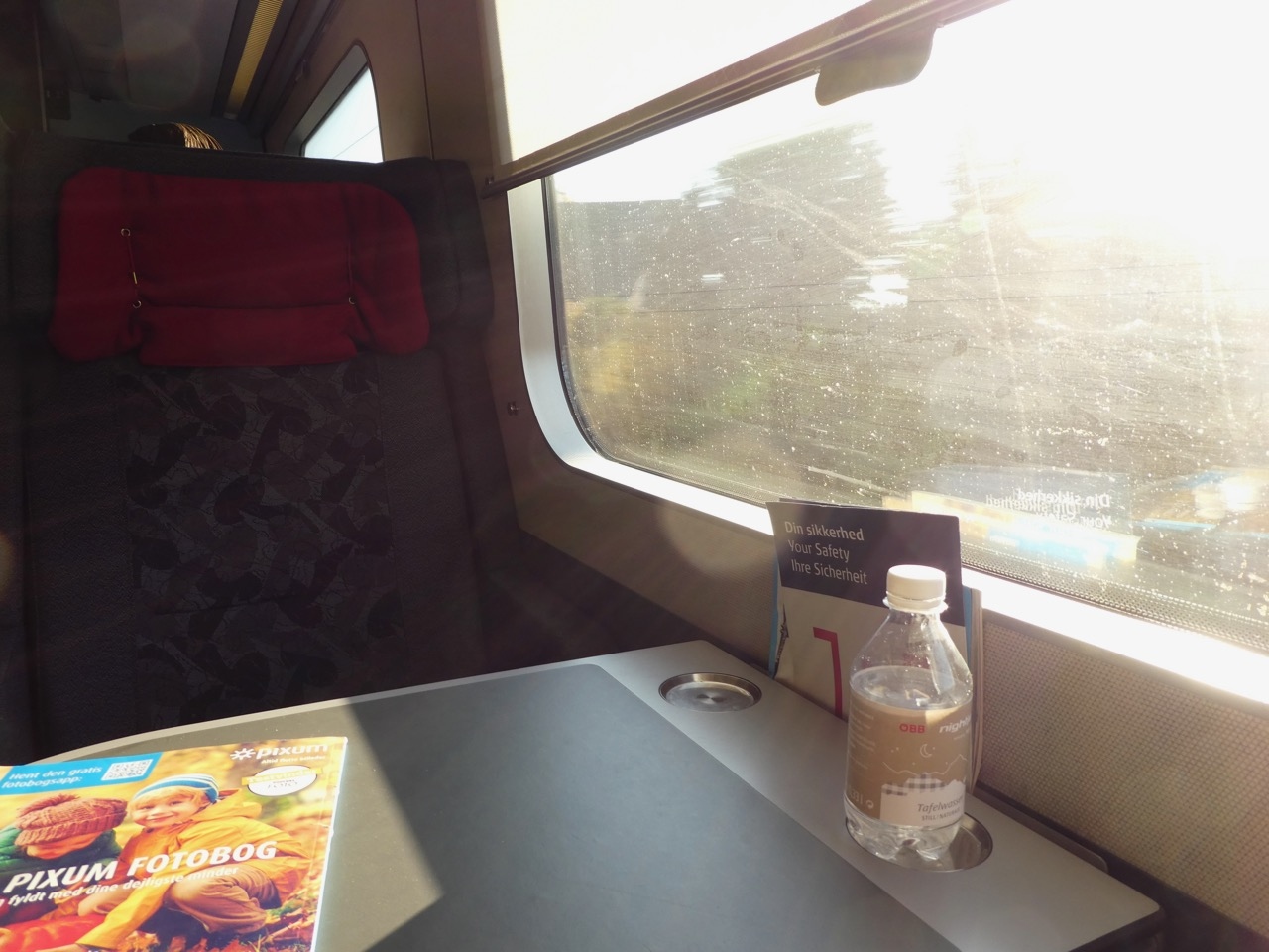 なお、12:17発のザルツブルグ行きユーロシティーはオーストリア編成で、1等車はなんと4人個室。普通は5~6人個室なので、破格のゆったり感。レザーのソファーで高級応接間、という感じ。満席で座れなくて残念でした。- 旅行時期
