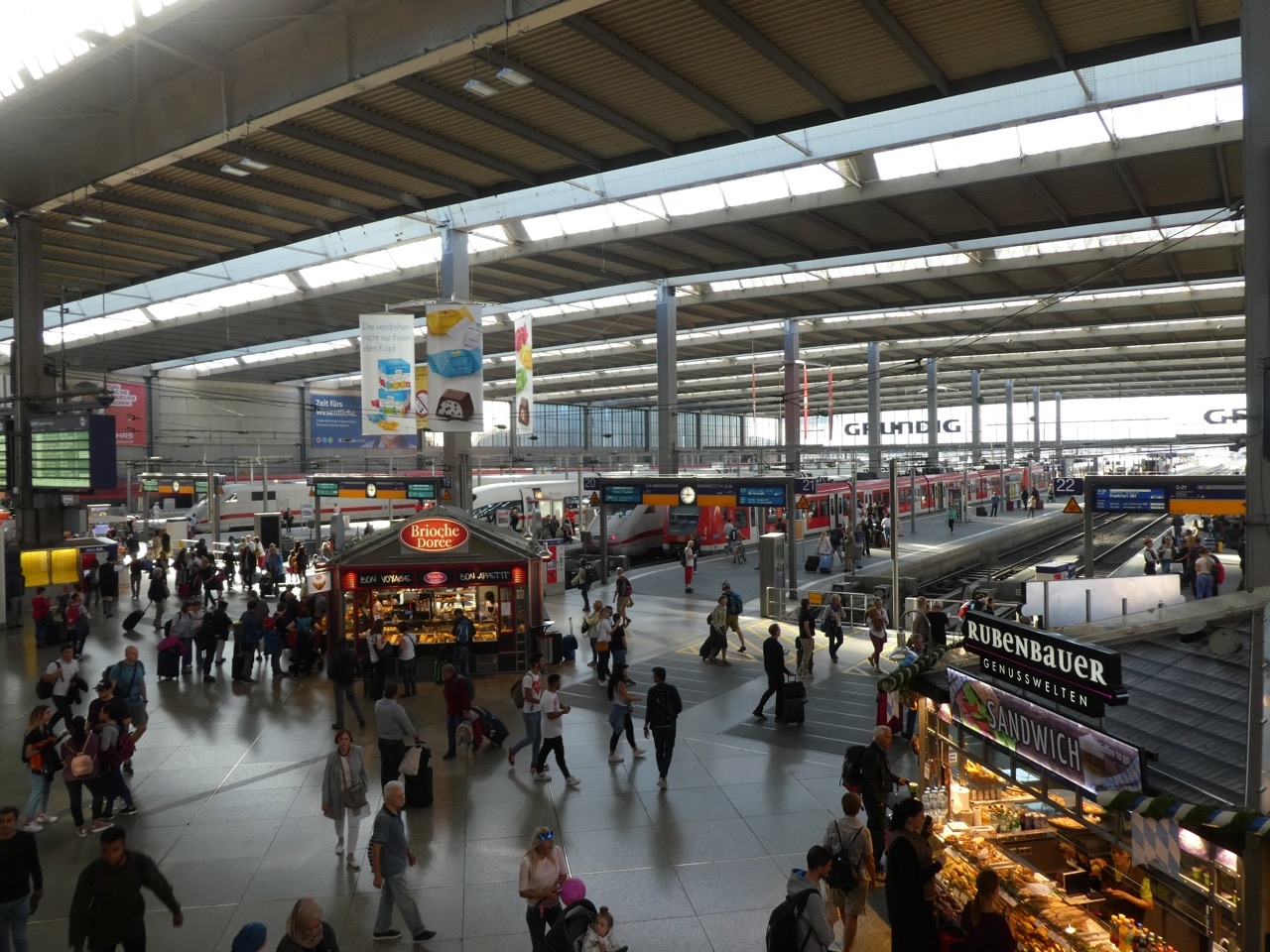 さすがドイツ南部の要衝。広いです。大きく分けて4箇所に分かれてます。メインはドームの中ですが、左奥と右奥に付け足しのように地方行きのホームの塊があります。そして右側手前から地下に降りたところにあるSバーンのホーム。拡張に次ぐ拡張でこうなったのでしょう。わざわざ不便に作るわけがありません。そう納得します。