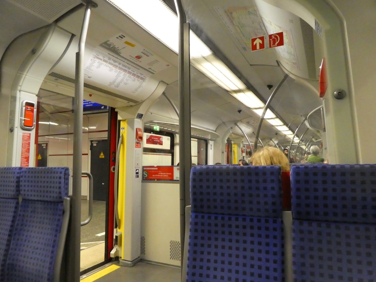 ミュンヘン中央駅からマリエン広場まで乗車。昔は「オリンピック電車」というステンレスの電車でしたが、現在は赤色の新型に代わってます。車内はクロスシートです。通路幅は狭くドア周りも立ち席少ないので狭く感じます。