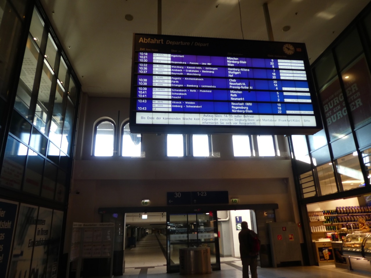 インゴルシュタットとの間を往復。片道はRE(快速)、片道はICEでした。速度差はああたりまえですが、REも昔の特急型客車を使っていてロマンスシートでリクライニングもして快適でした。狙ってみるのもいいでしょう。ただ1等席はほんのわずかしかなく、1等のパスを持っている方には不向きです。