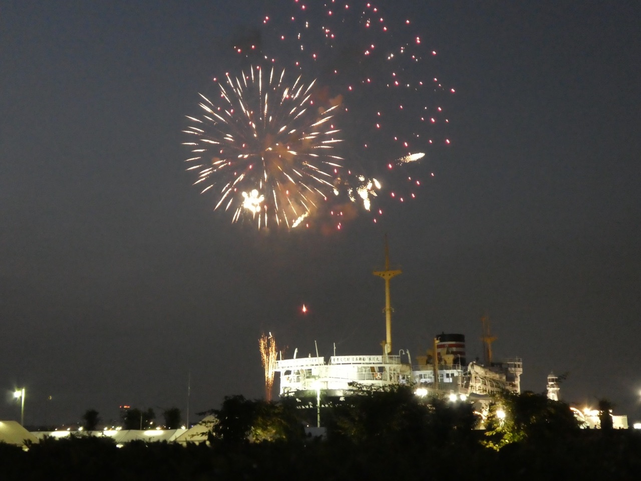 夏の前というか梅雨明けかどうか微妙な時期のせいか、盛夏の花火大会よりは空いている気がします。花火の直前の山下公園到着でもなんとか立ち止まってみる場所がありました。