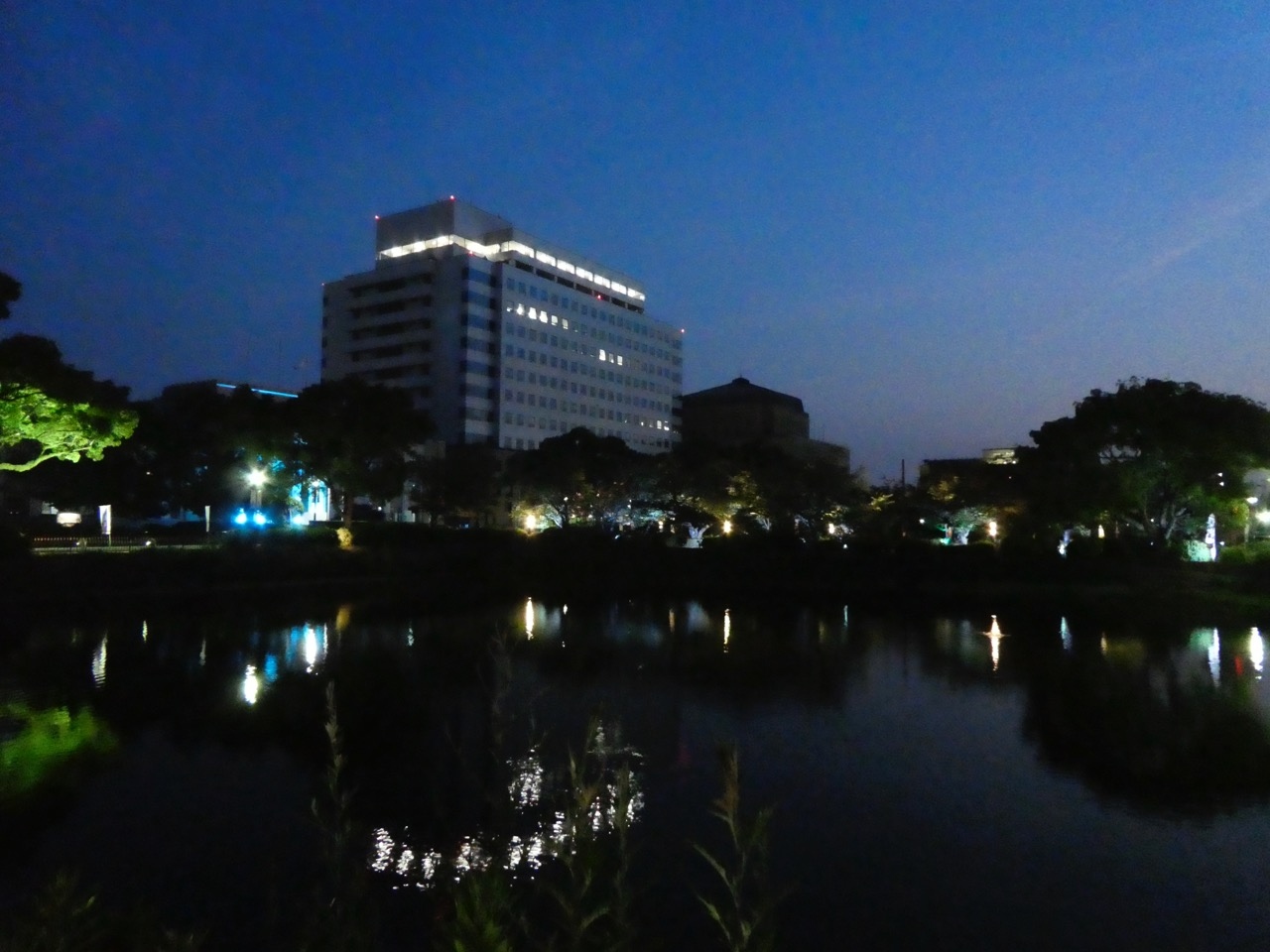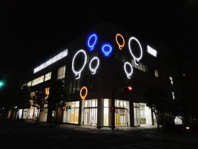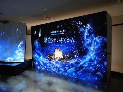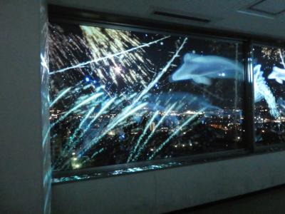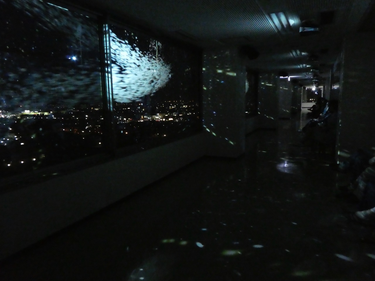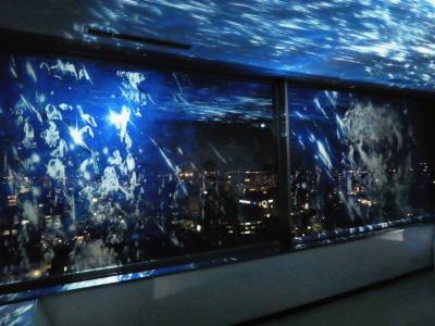 アート県庁プロジェクト、と称して夜に展望室の窓にプロジェクションマッピングやってます。ある程度の期間で次のバージョンに移行するので、いろんな物語を見ることができます。訪問時は「星空の水族館」と称して、蒸気船が空に出航して昇っていき、星と海を航海するような物語を音楽に乗せて放映していました。夜景に重なってとってもきれい。必見です。