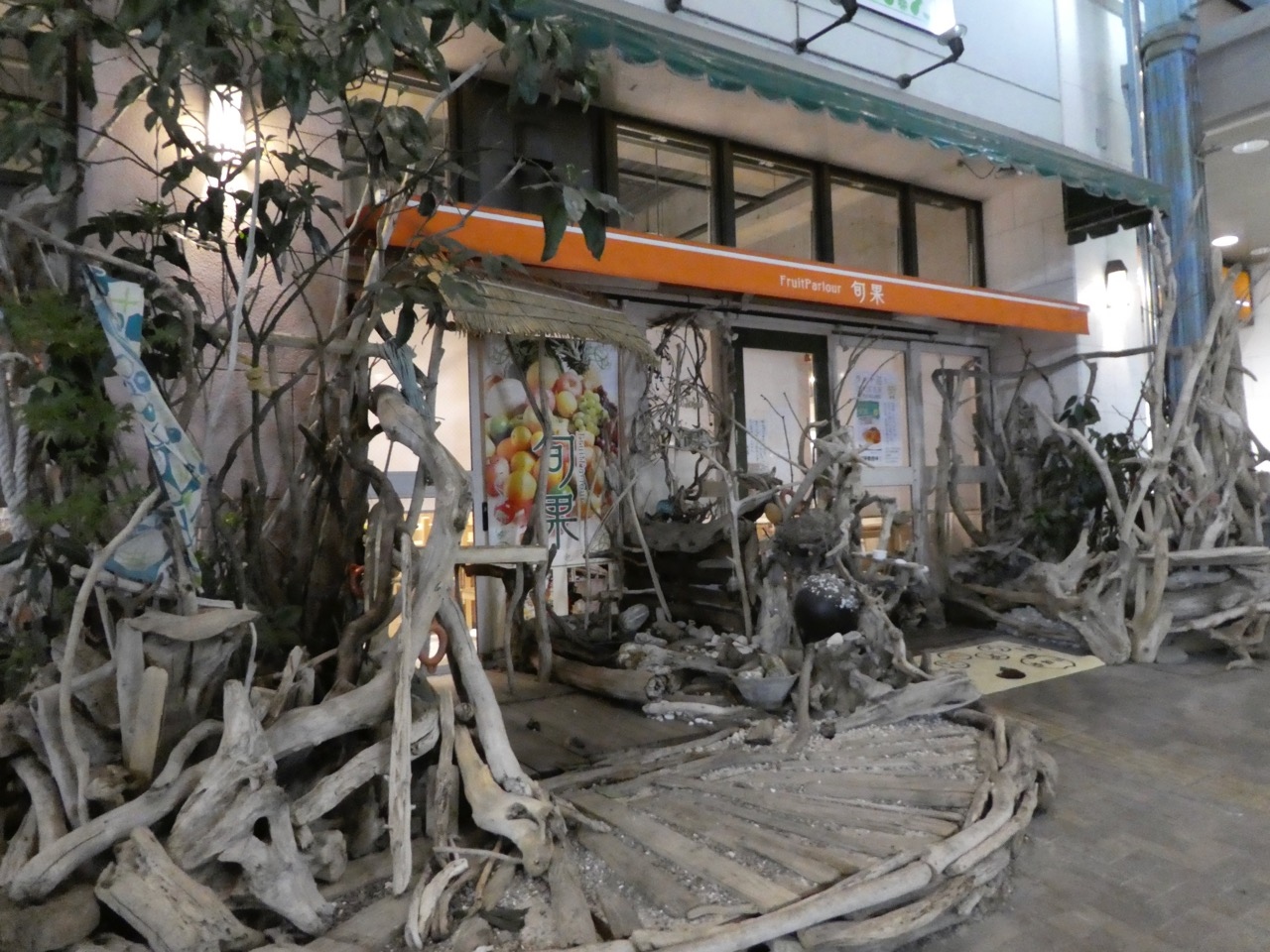 その正面がこれでもか、と流木アートで飾られてます。アーケードの通りにハミ出しているようにも思えるのですが、これを見たらそんなことどうでもいいような。