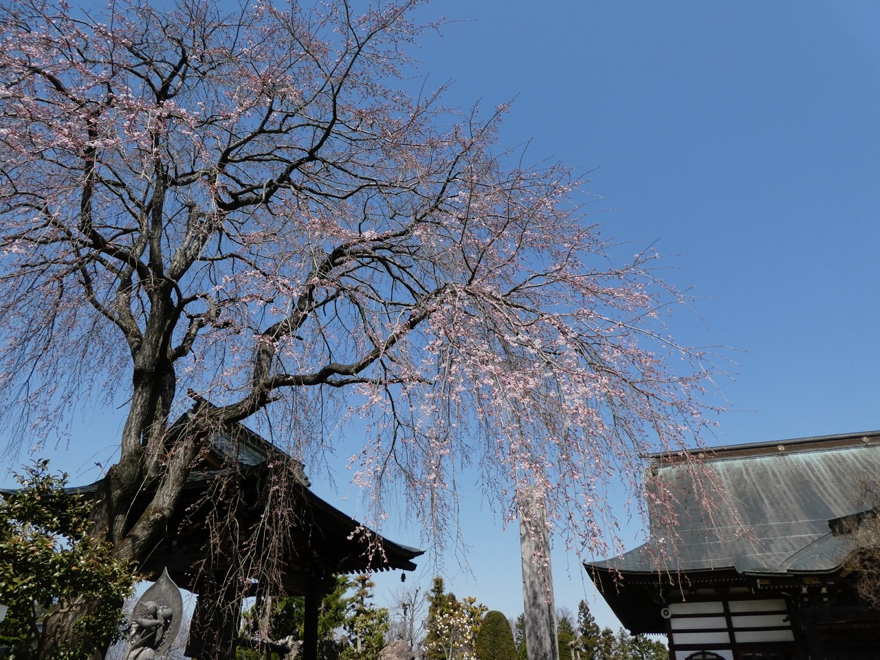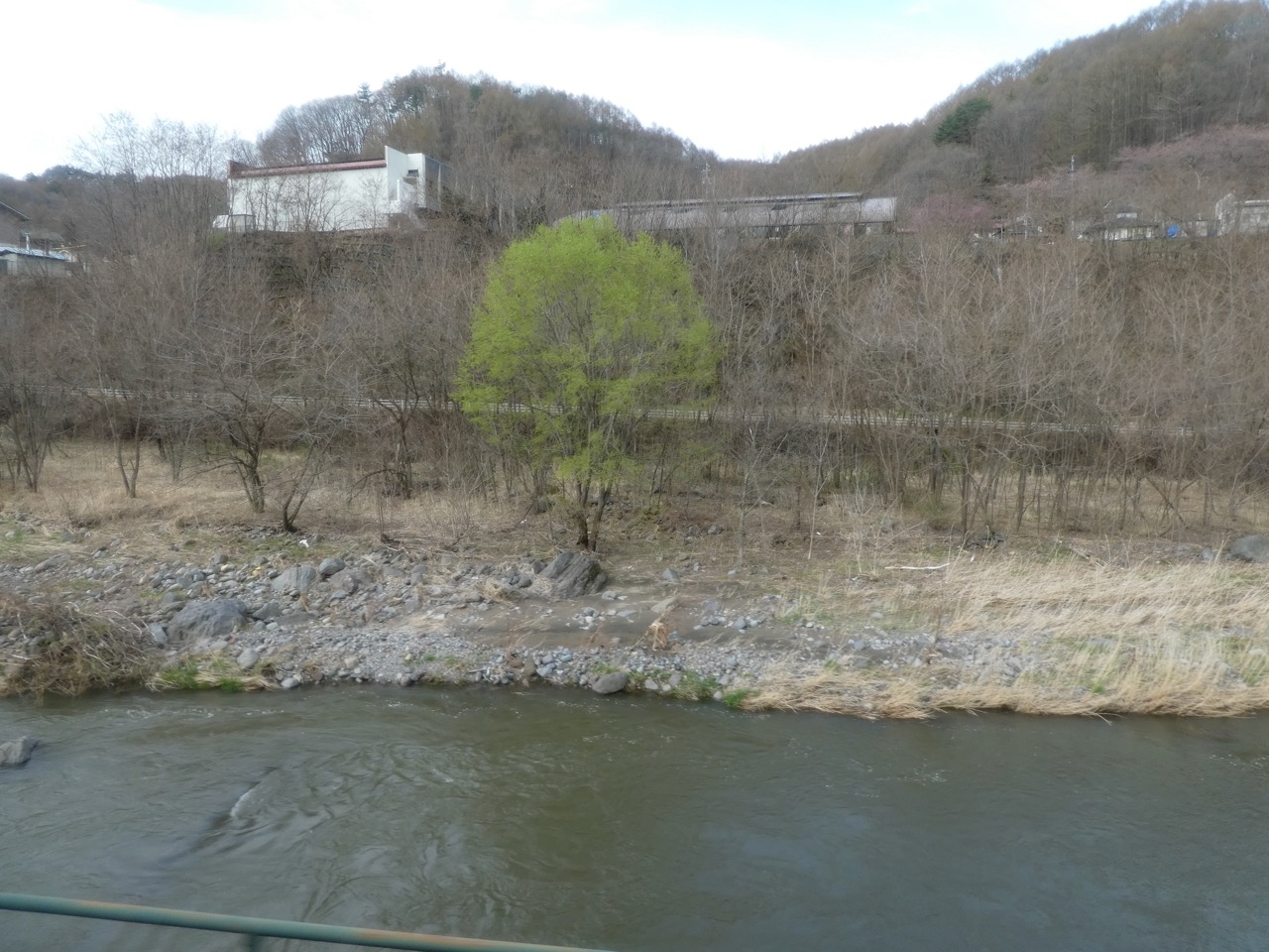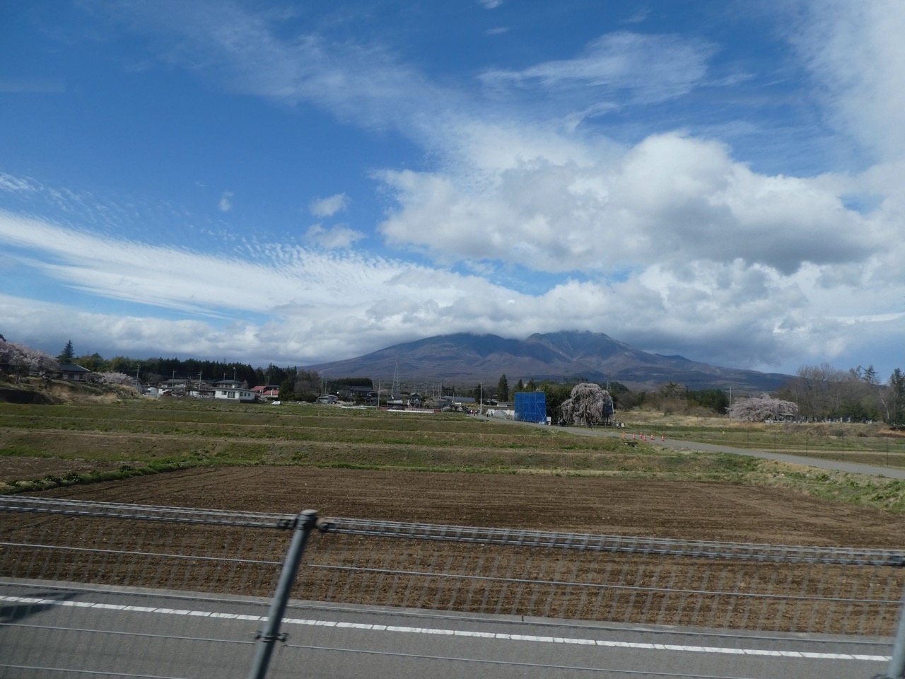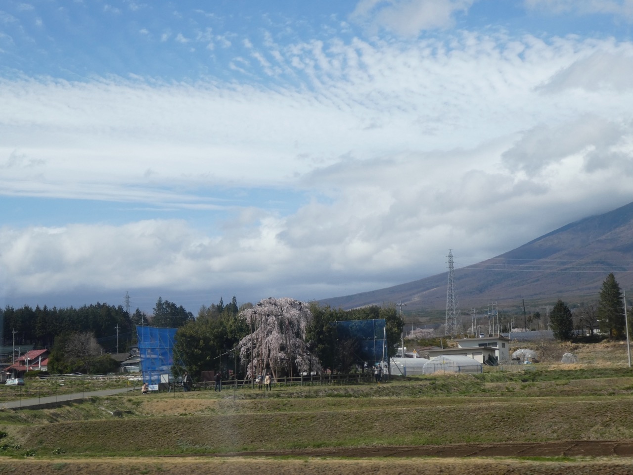 中央本線の上り列車だと小淵沢を発車して5分のど行った左側(八ヶ岳側)に他の桜と違って一本だけ、存在感をもって立つ古い大きなシダレサクラが線路からほんの100mほど離れた場所に見えます。見物l客が周囲に多いことでもすぐわかると思います。西側には青い防風ネットが張ってあることでもわかると思います。山梨に限らず、桜並木ではなく1本立ての古い桜で電車から見ることのできる桜はここくらいでしょう。ごく近くで見上げるのもいいですが、こうして電車の窓から流れ去っていく桜の名木をみる花見もまた旅情をかんじさせていいものです。