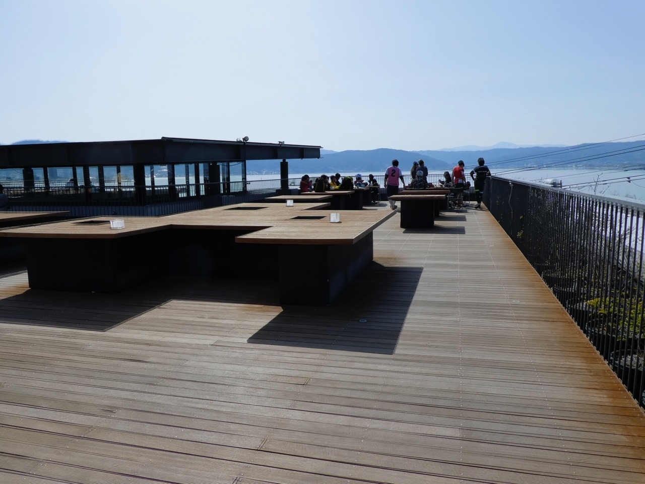 商業施設のようでもあり、レストランの集まりのようでもあり、要は観光拠点だろう。となると屋上があるに違いない、と入ってみました。ありました。流行のテラスのような広々とした屋上が。ウッドデッキで木のテーブルがいっぱい。展望台としては最高です。まずは屋上に上がってみましょう。