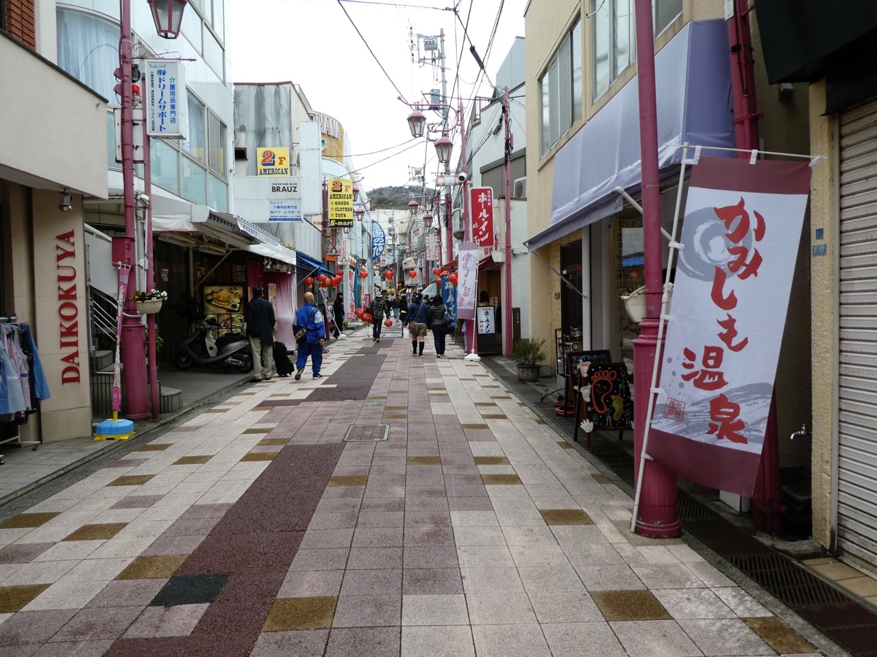 伊東駅から海の方に続く商店街。湯の花通りはお土産物街で観光客でまあまあ賑わってました。