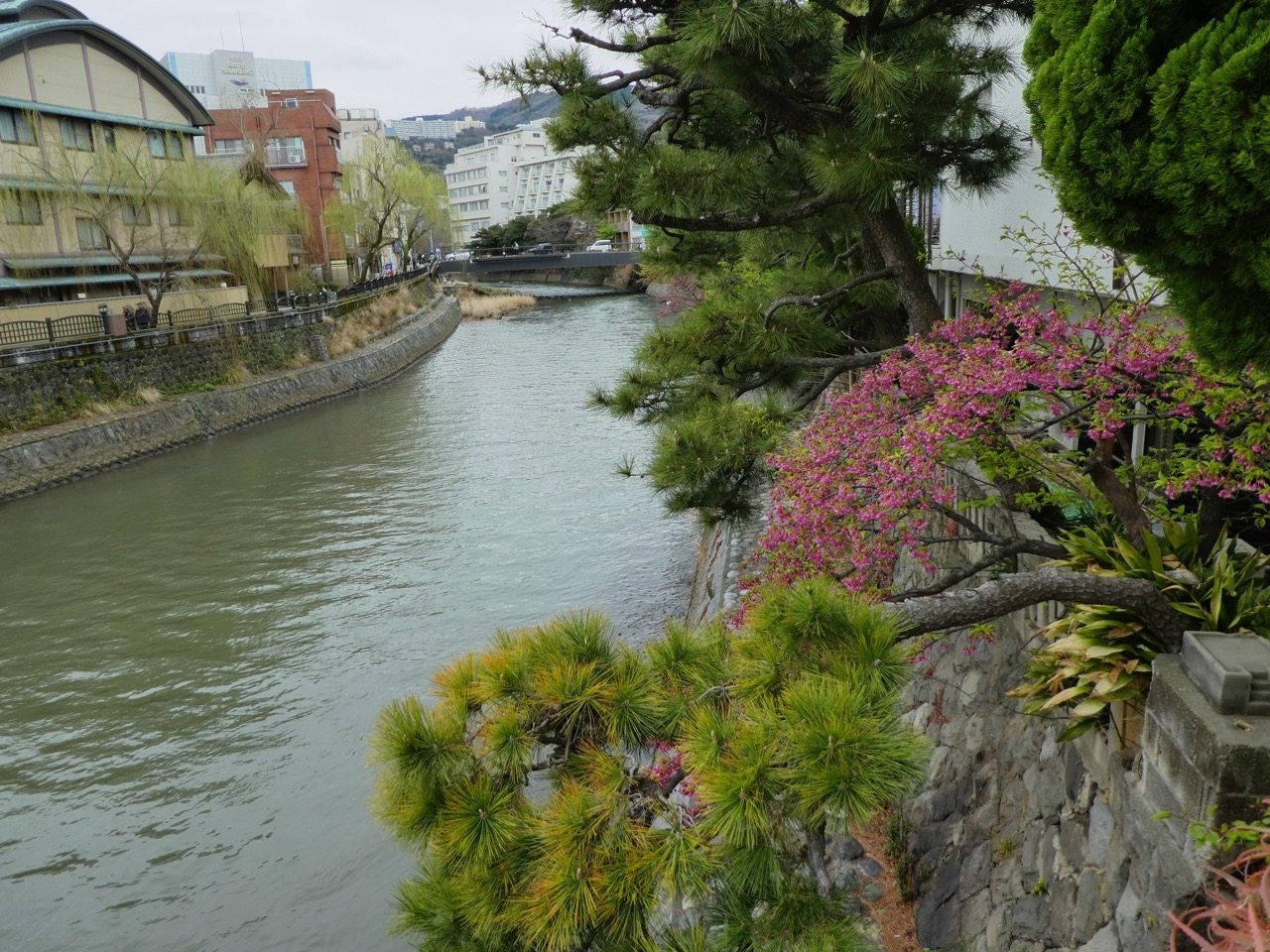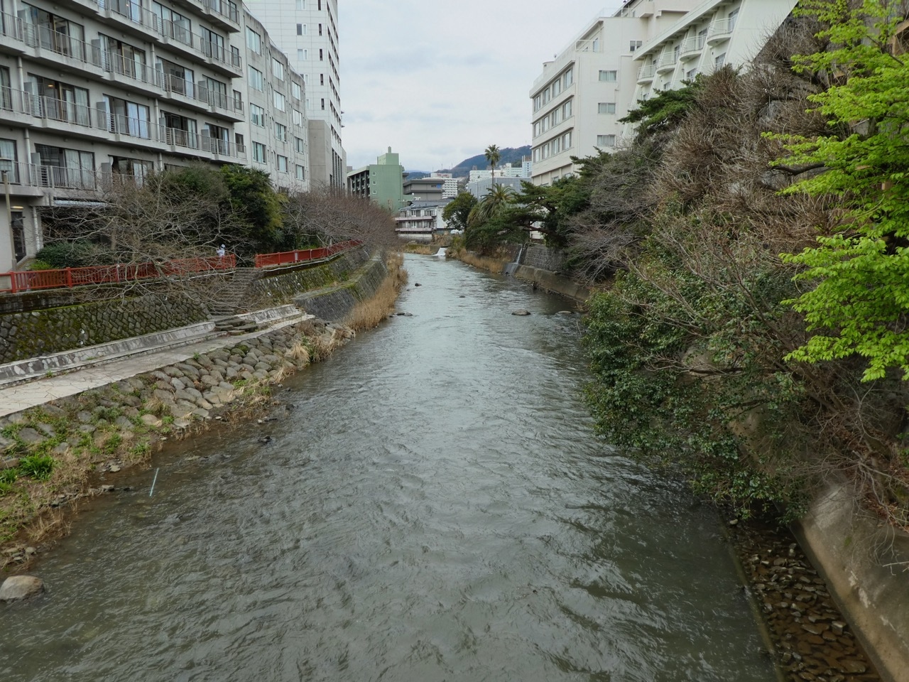 伊東駅から伊東港に行くまでに湯の花通りからキネマ通りの商店街を抜け、川に突き当たったところから川沿いのコースをとりました。その松川に沿ってある遊歩道です。なので短い区間のみの歩行です。