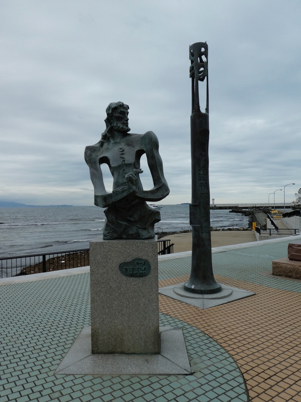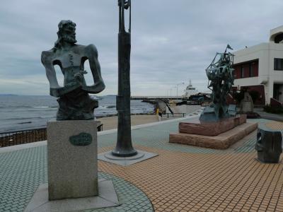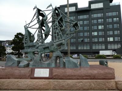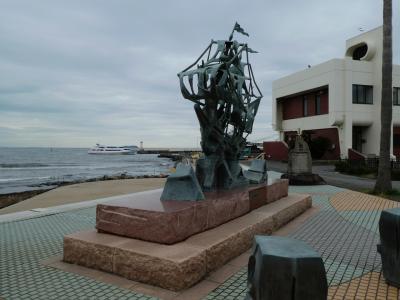 伊東港の脇、松川の河口の右側にある公園というか、小さな広場。三浦按針を抽象的に表したかのようなオブジェと、帆船のオブジェが並んでます。三浦按針は江戸時代の最初期に家康と会い、初めて西洋式の帆船を造った人。伊東港の脇の役者として申し分ないです。とくに船のオブジェは空に飛んでいくかのような雰囲気がいいですね。