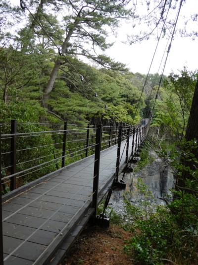 伊豆高原駅から踏切を渡って、小川に沿って一直線に海へ。滝になって直接海に落ちる小川の河口から右に数分。吊り橋が出現。このあたりが橋立というようです。そこに架かる橋です。海を渡る、というよりは入江を渡る感じ。なので下は荒波ではないので景色としてはいまひとつ。高さ感もちょっと感じられず。