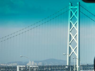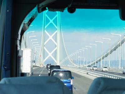 四国方面から高速バスで淡路島を貫通、明石海峡に近づくと前方右手に明石海峡大橋が。
