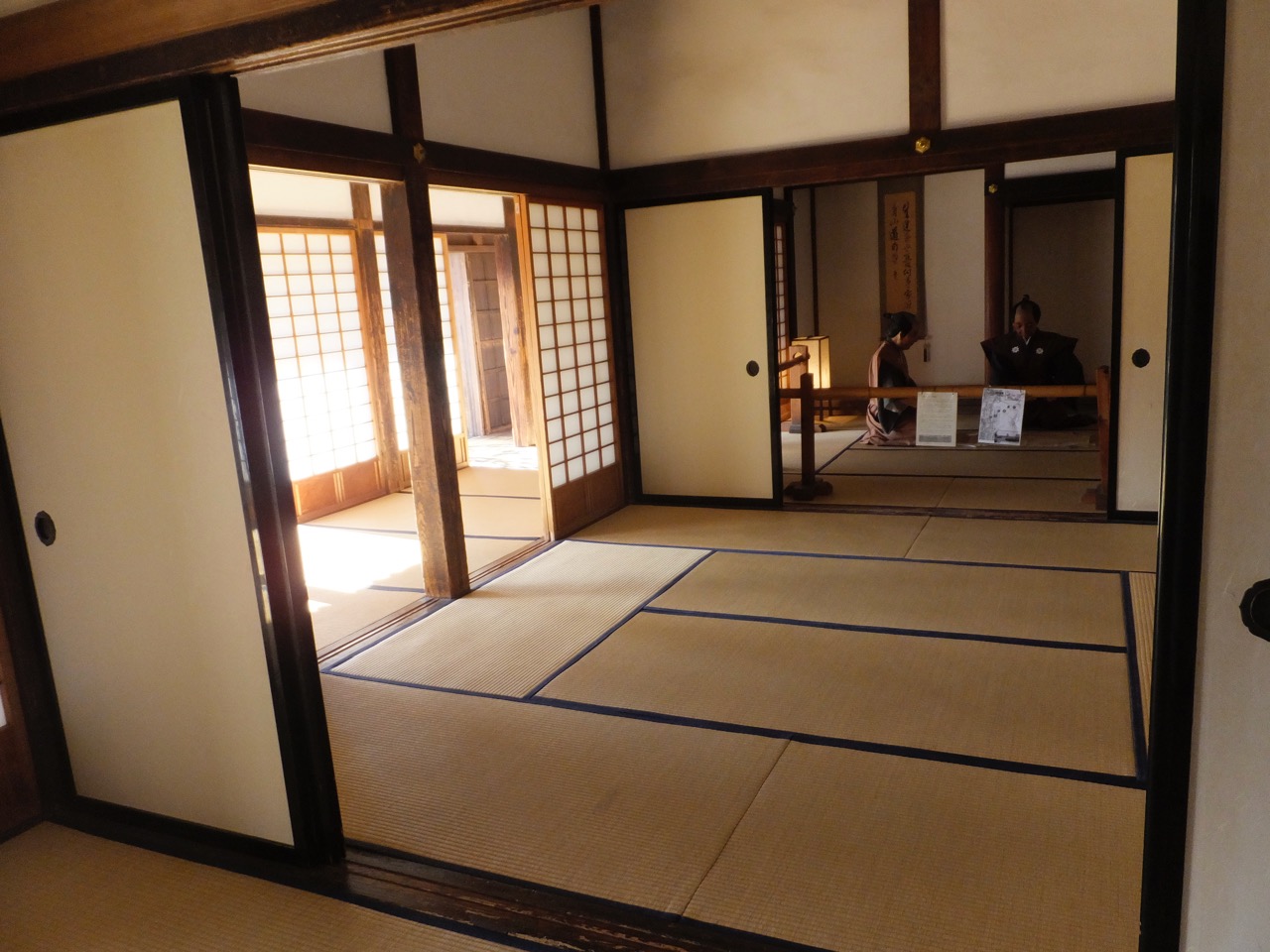 さて、正面玄関のあたりの一番立派な部分が残っていて、あとの部分はほとんど全部明治維新で壊され、なくなってしまっています。場内の資料でそのことがわかります。でも入ってすぐの大広間は天井も高く欄間もきれいで障子は金が一部貼ってあったのかな、という質実剛健の中にも華麗なものが少し。城主の威光も必要ですしね。