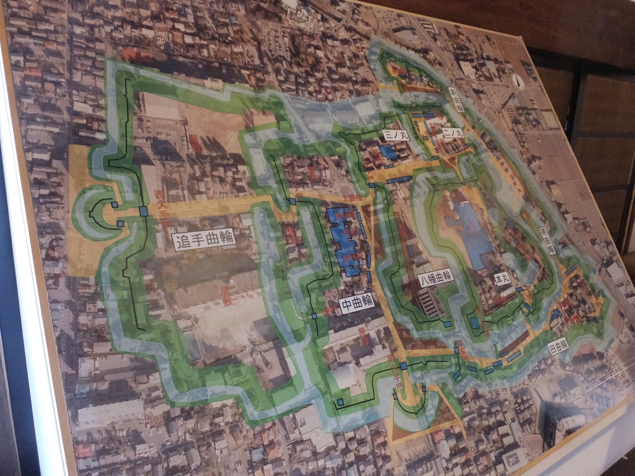展示では、現在の川越の航空写真に昔の川越城の形を書き込んだ図が興味深かったです。