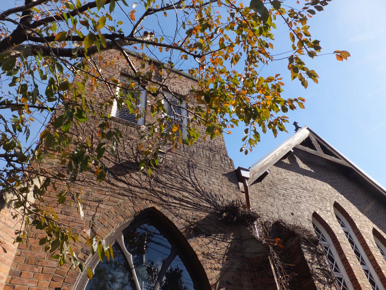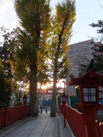 鳥居を入ってすぐ、2本のイチョウの間がとくに狭く、都会の神社だなあ、と感じます。