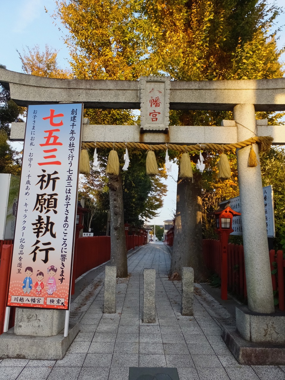 川越の街中に挟まるようにある小さな八幡さま。参道も細く、人がすれ違うのもちょっとたいへん?