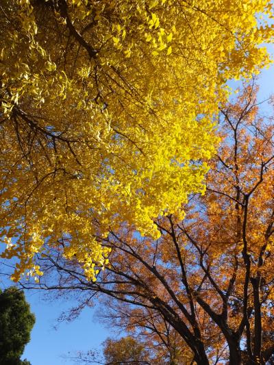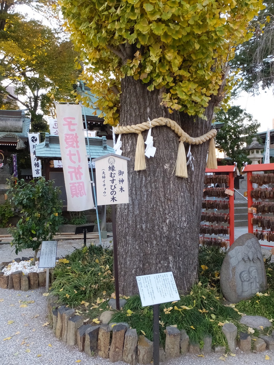 が、境内、拝殿のあたりはちょっと広く、目立っていたのがここもイチョウ。とくに御神木の縁結びの木、夫婦イチョウは面白いです。平成天皇が生まれた年、昭和8年に2本並んで植えたイチョウが成長の過程でくっついてしまったので、それが「縁結び」「夫婦円満」に結び付けられたようです。もしかしたら参道の2本のイチョウも将来そうなるかも?