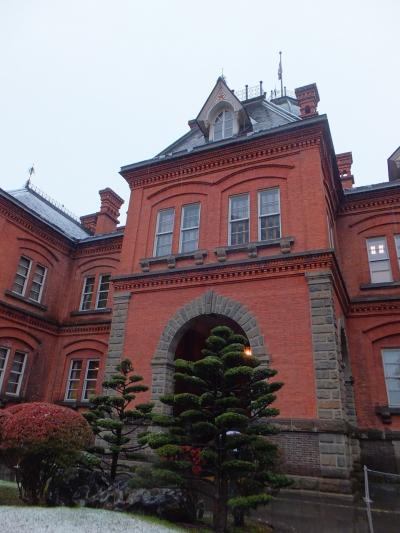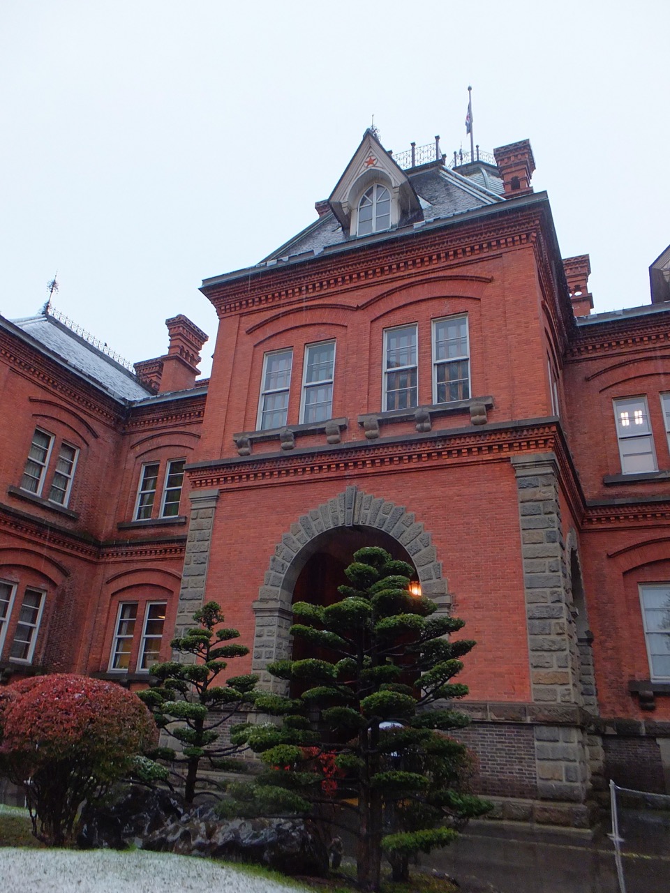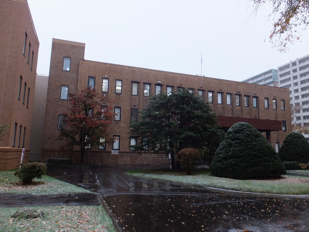 北海道大学の中心、大学生協の手前の左側、ひときわ明るいレンガ色の建物。旧理学部の建物。よくみるとレンガ造りではなくレンガタイル張りでした。入り口部分がとくに明るい色で天気が良かったなら青空に映えただろうに。その後ろの本体は赤レンガ色で、その対比もきれいです。