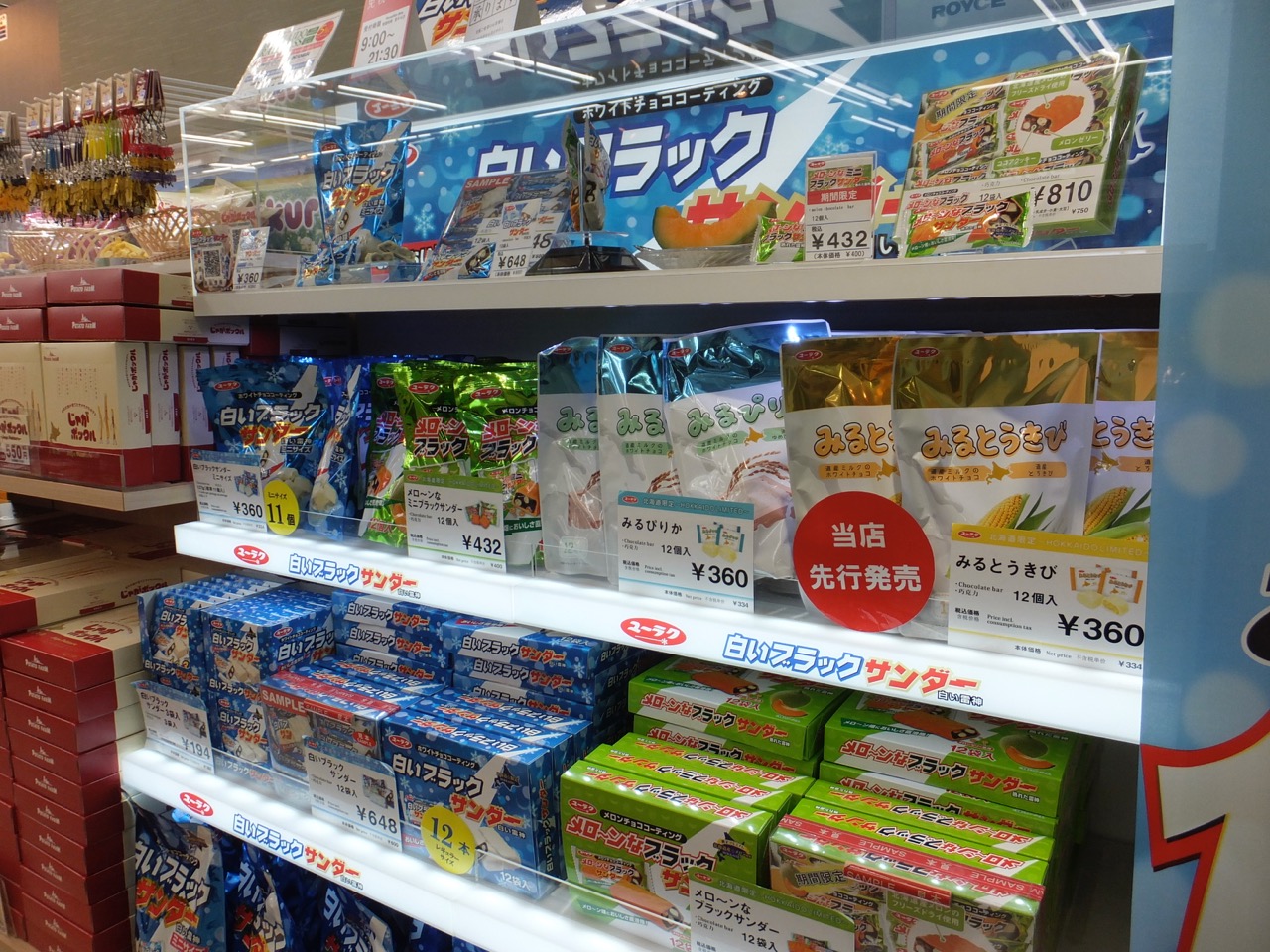 昔はなかなか買えなかった「じゃがぽっくる」も普通にあり、白いブラックサンダーやメロンのブラックサンダーなども大量に陳列。ここだけでお土産物はOKというくらい。
