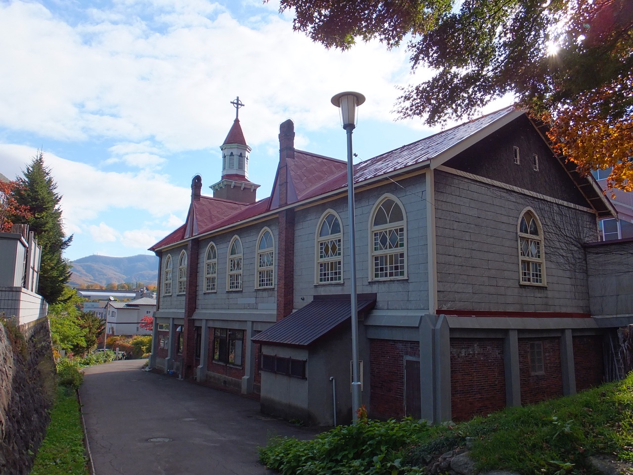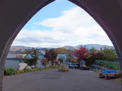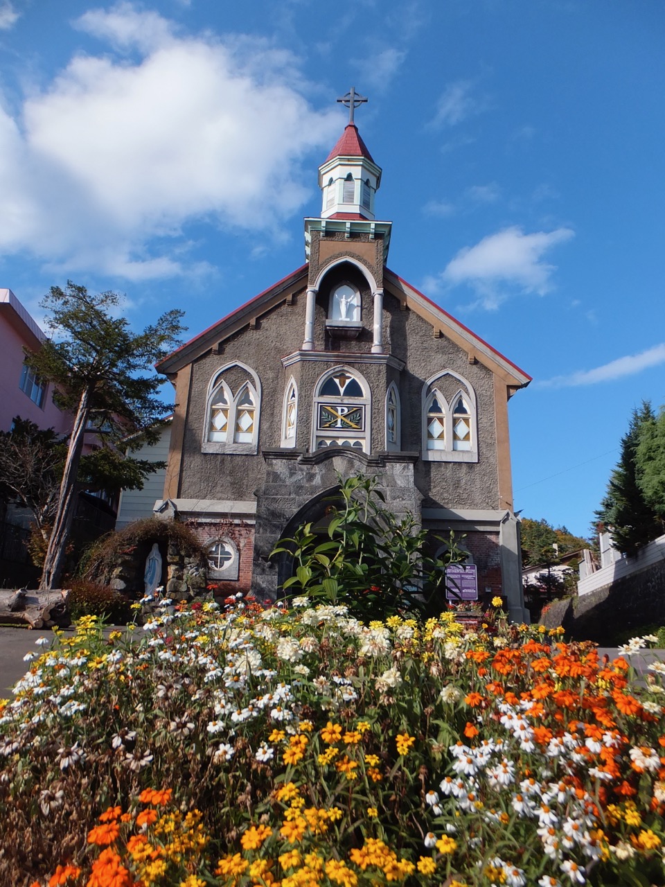 旭展望台から降りると右手の方に続く道を行ったところにあります。カトリック教会はみなそうなのか、自由にお入りくだいさい、との表示があったので人気のない建物に1人入りました。静かです。色ガラスの窓がきれいです。側面はアールのついた窓が並んでいてこれもきれいです。
