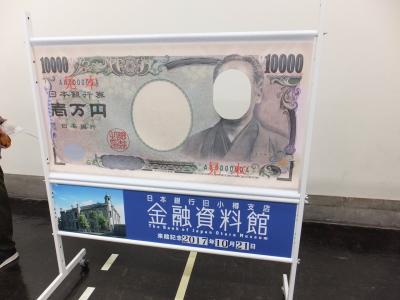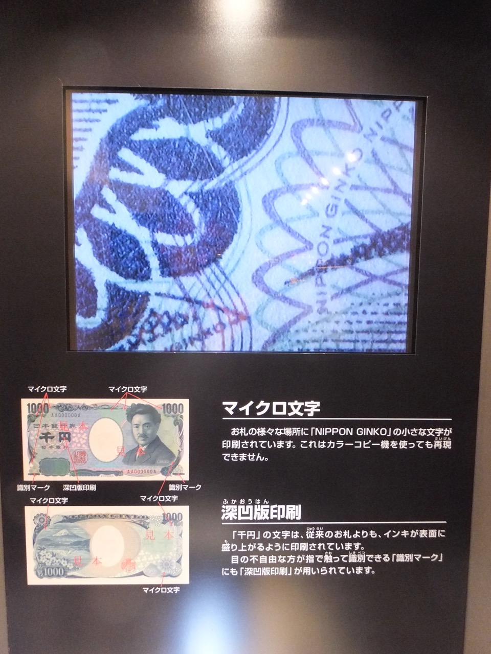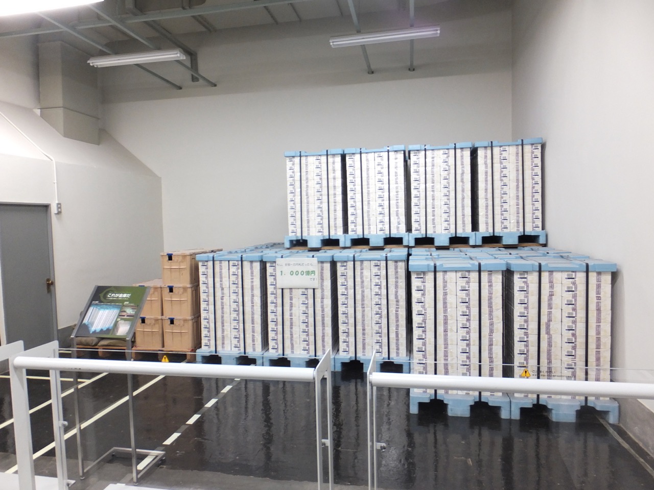 1000億円の札束の山、お札の偽造防止の数々の展示。